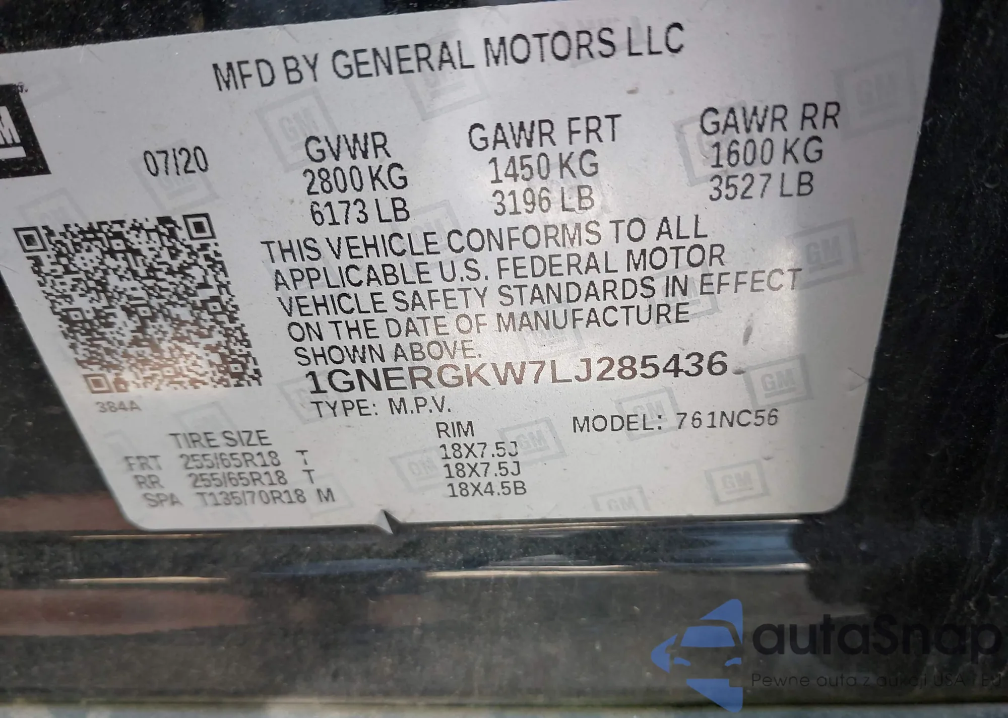 VIN: 1GNERGKW7LJ285436
