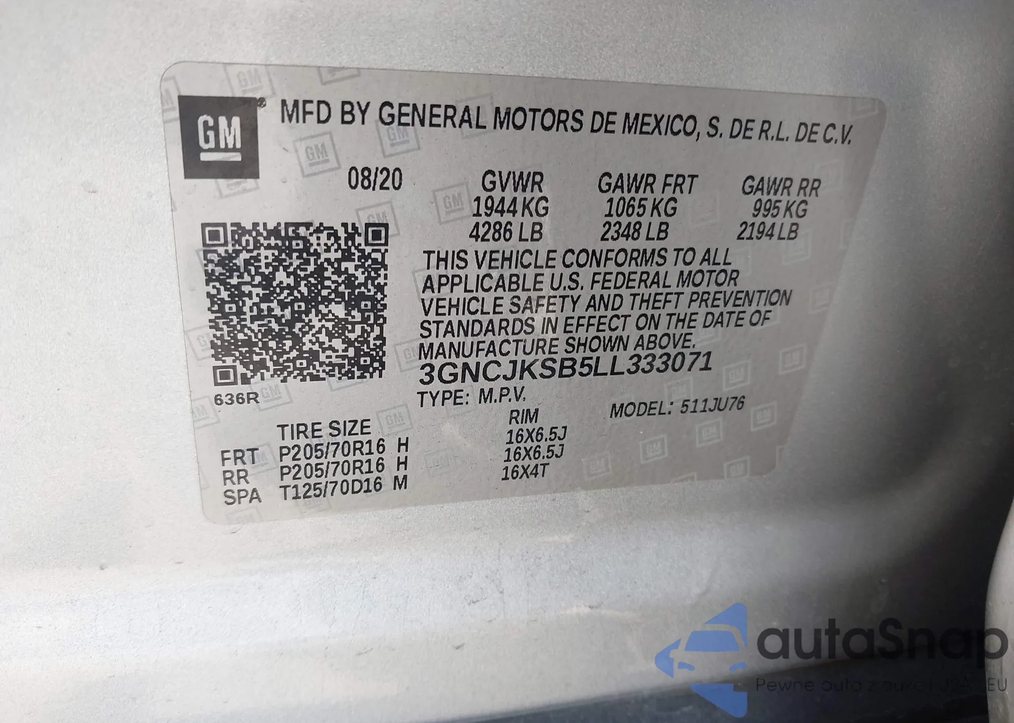 VIN: 3GNCJKSB5LL333071