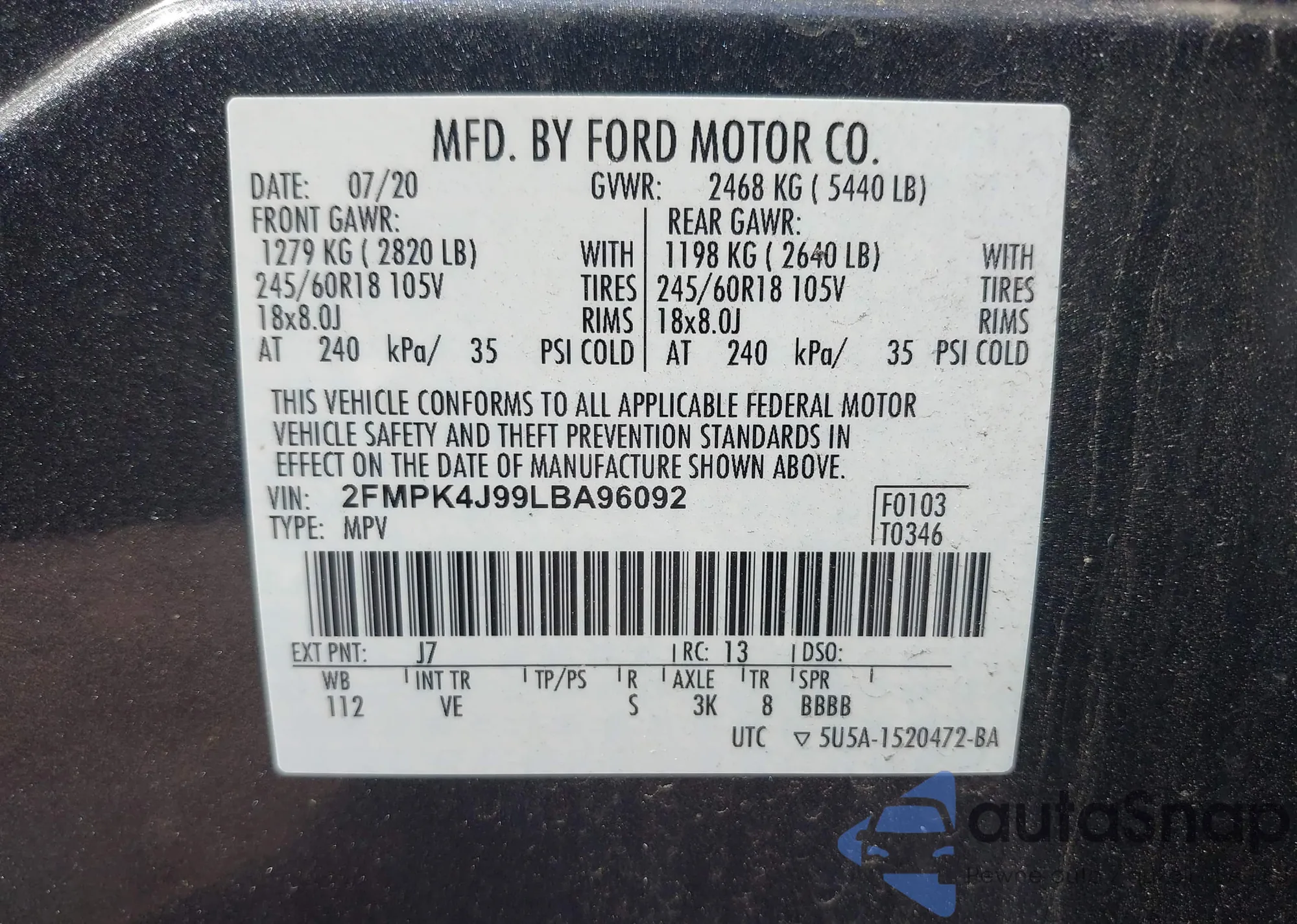VIN: 2FMPK4J99LBA96092