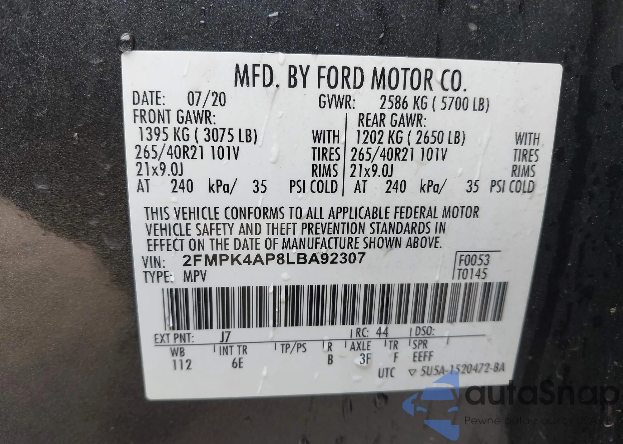 VIN: 2FMPK4AP8LBA92307