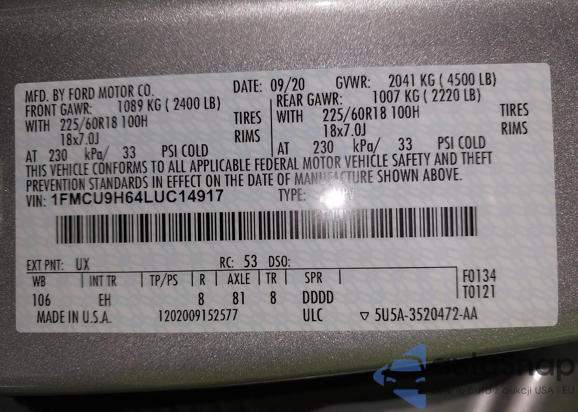 VIN: 1FMCU9H64LUC14917