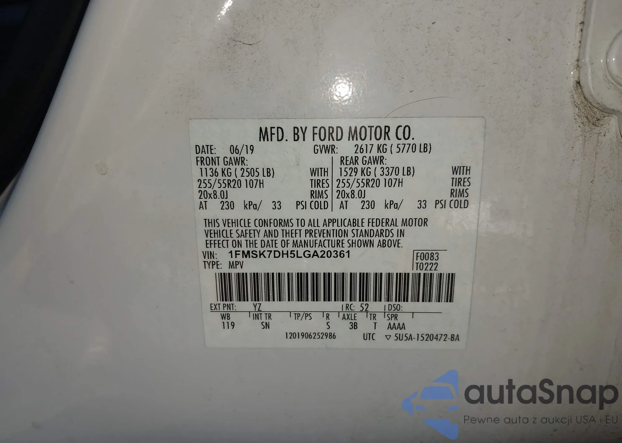 • VIN: 1FMSK7DH5LGA20361