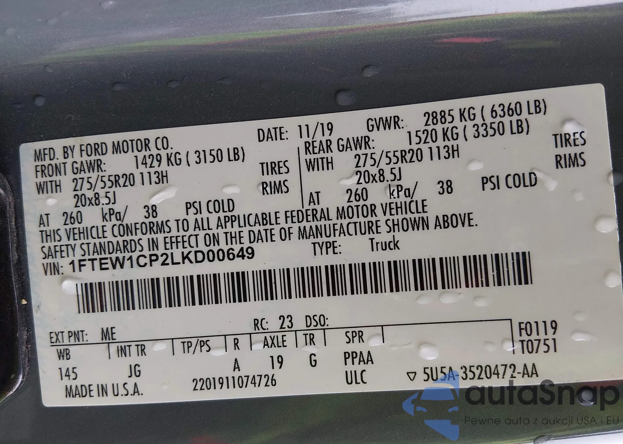 The car Ford F-150 2020 (VIN 1FTEW1CP2LKD00649) has not been auctioned before. The documents are clean, and the mileage matches or is below the market average. Sold by an insurance company – we recommend purchase. Delivery to the port will take approx. 6–8 weeks.