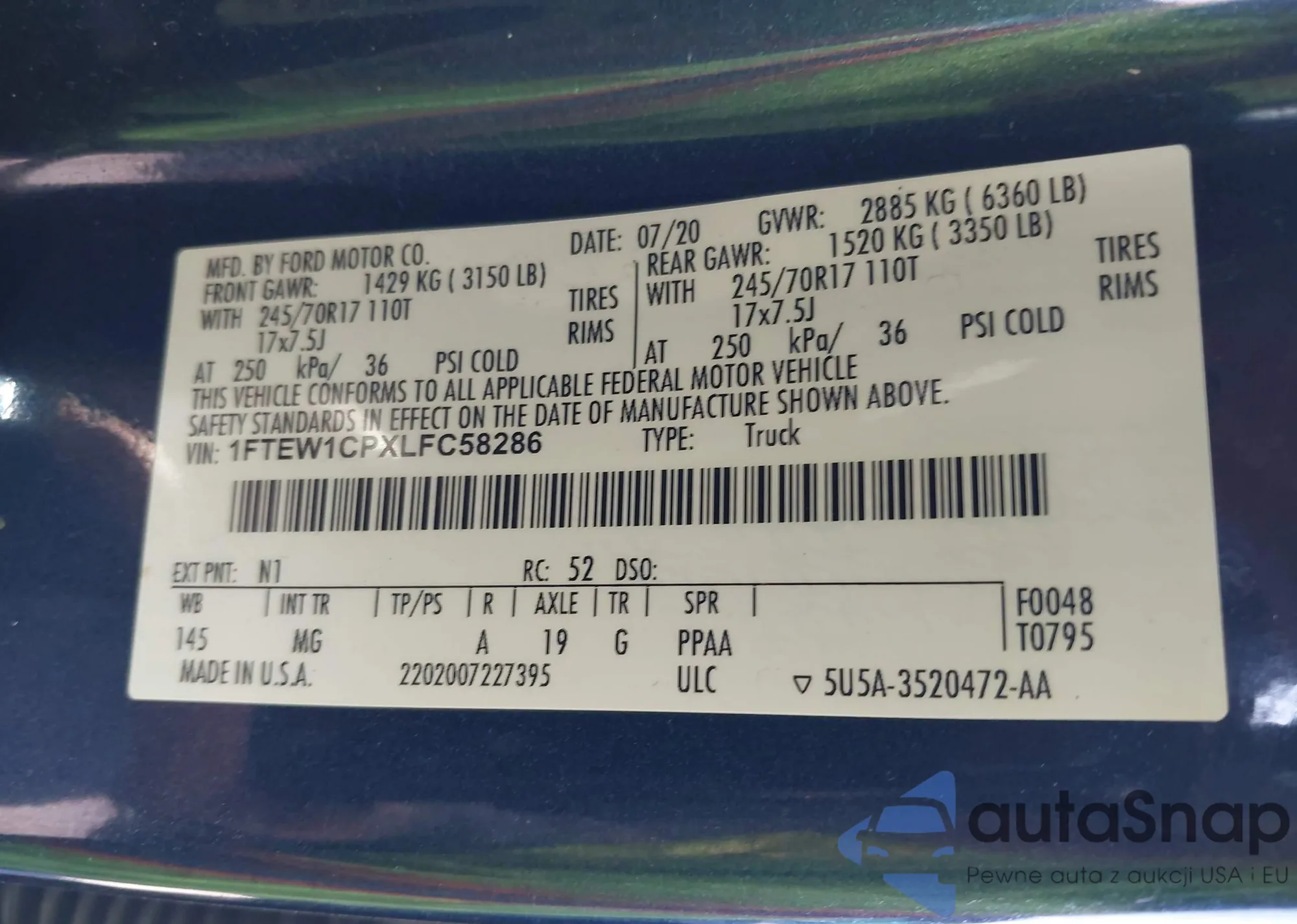 The car Ford F-150 2020 (VIN 1FTEW1CPXLFC58286) has not been auctioned before. The documents are clean, and the mileage matches or is below the market average. Sold by an insurance company – we recommend purchase. Delivery to the port will take approx. 6–8 weeks.