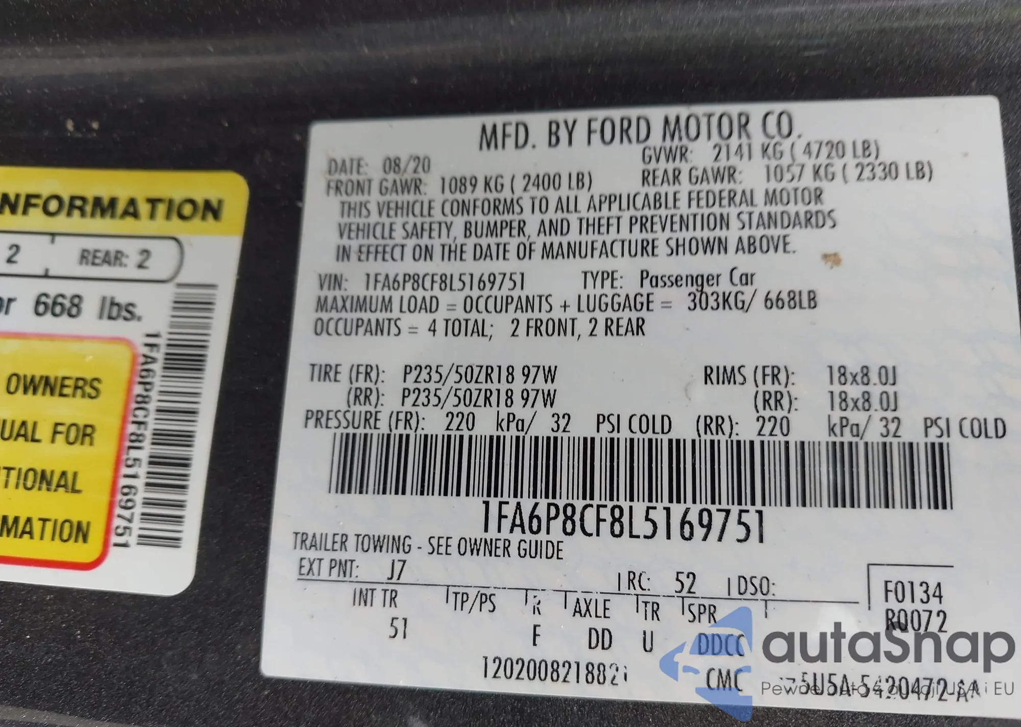 The car Ford Mustang 2020 (VIN 1FA6P8CF8L5169751) has not been auctioned before. The documents are clean, and the mileage matches or is below the market average. Sold by an insurance company – we recommend purchase. Delivery to the port will take approx. 6–8 weeks.