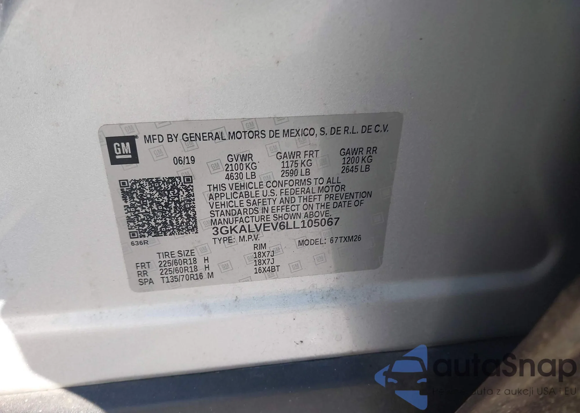 The car GMC Terrain 2020 (VIN 3GKALVEV6LL105067) has documents that prevent registration. Export and registration may be difficult. Contact AutaSnap experts to find alternatives.
