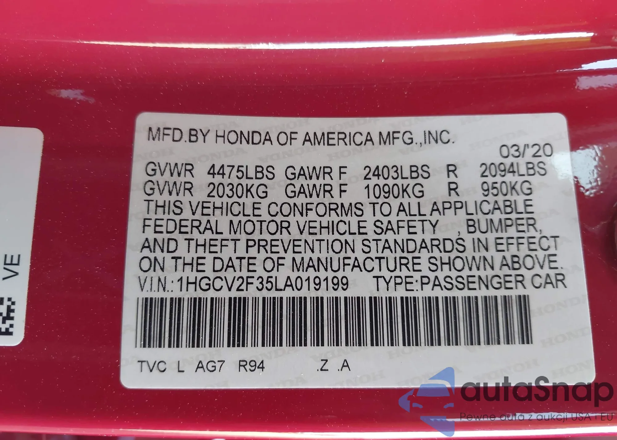 • VIN: 1HGCV2F35LA019199