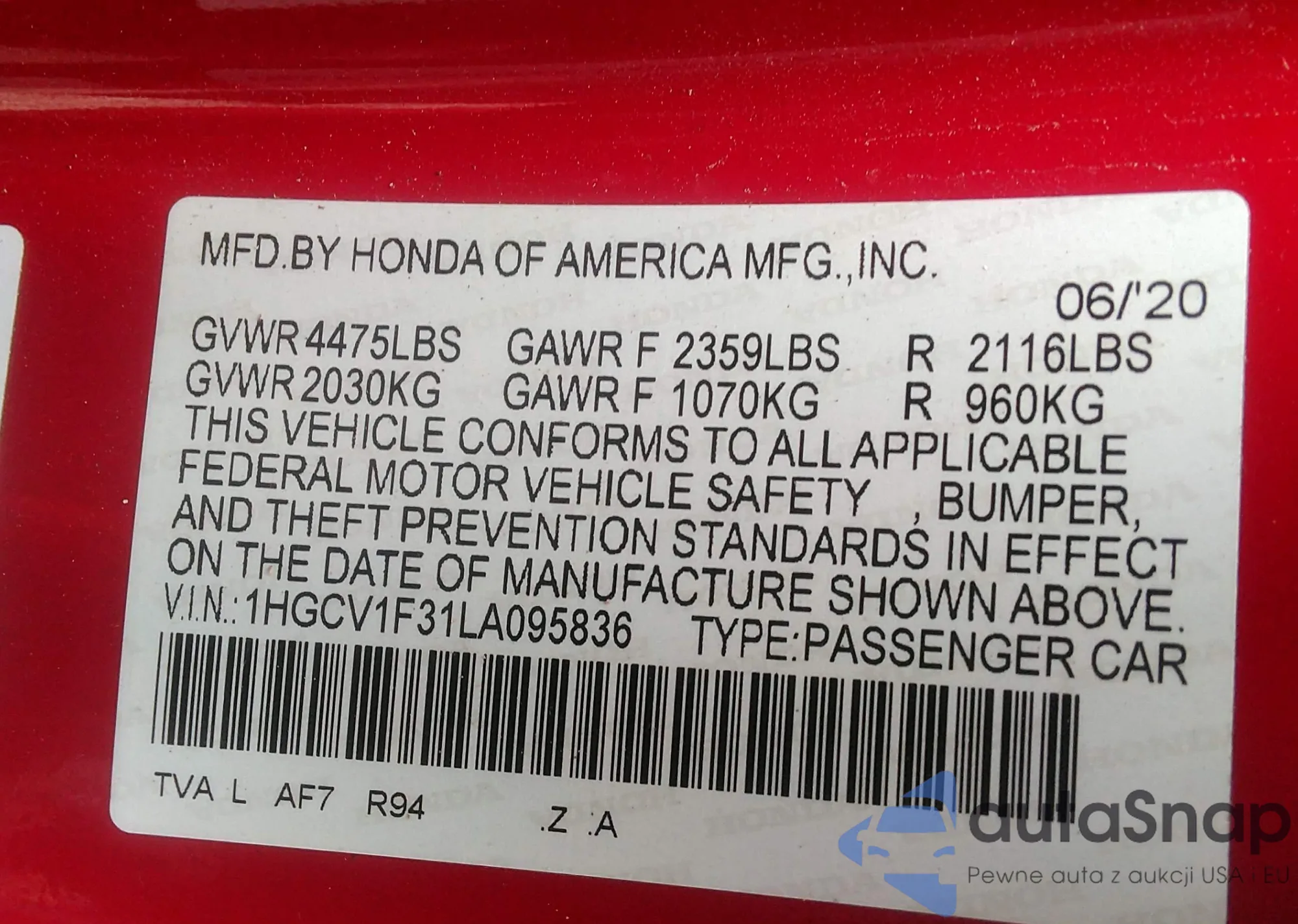 VIN: 1HGCV1F31LA095836