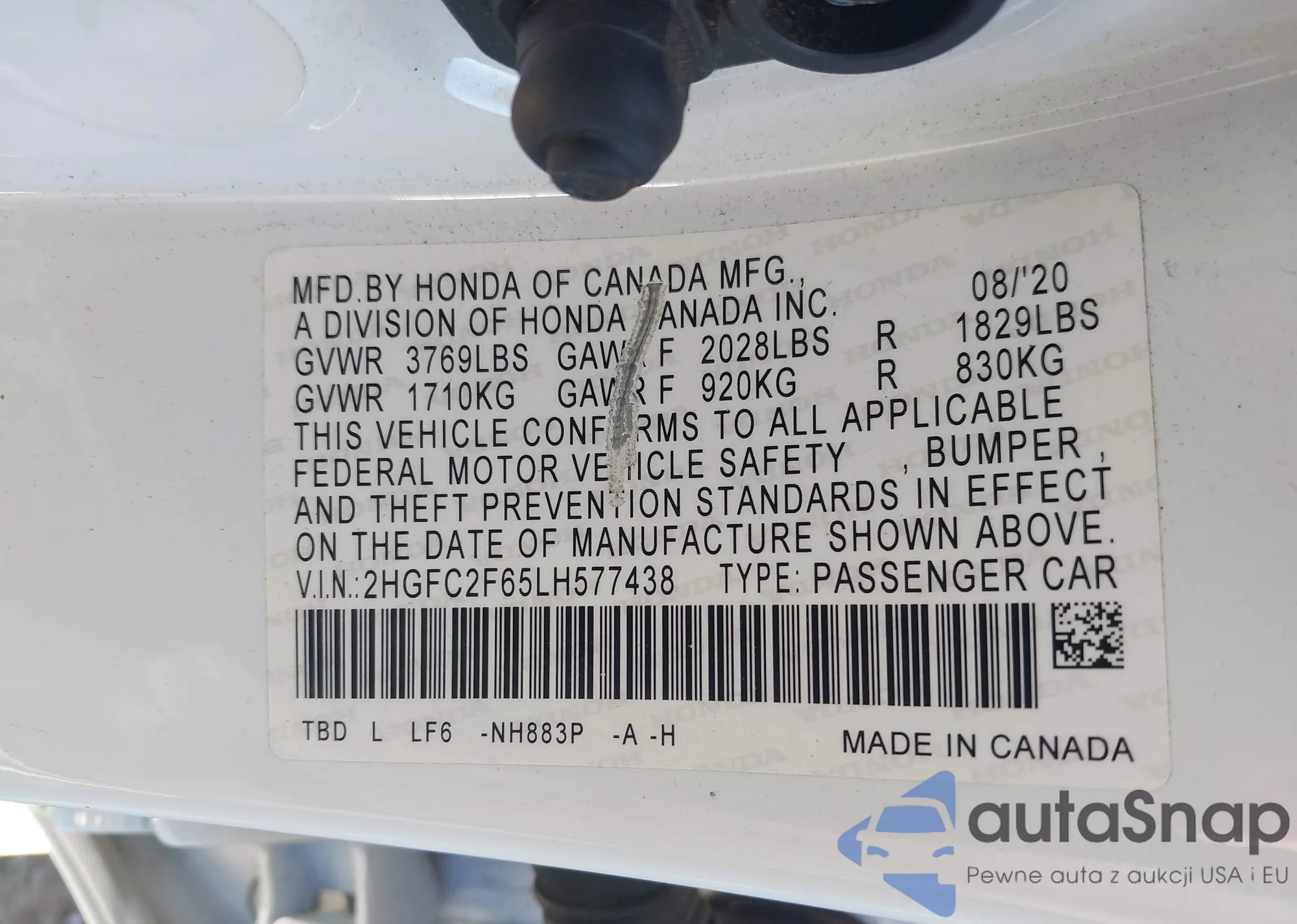 The car Honda Civic 2020 (VIN 2HGFC2F65LH577438) has not been auctioned before. The documents are clean, and the mileage matches or is below the market average. Sold by an insurance company – we recommend purchase. Delivery to the port will take approx. 6–8 weeks.