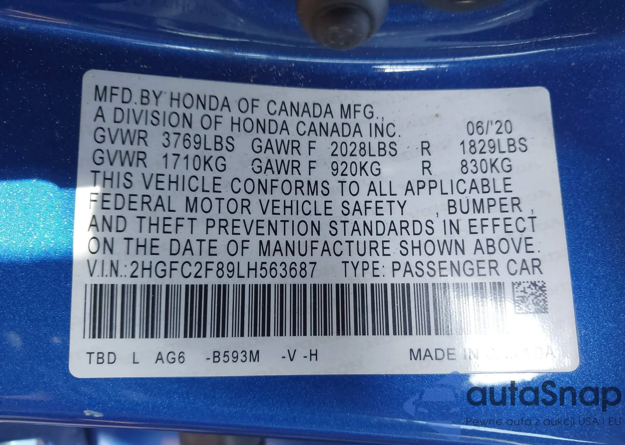 The car Honda Civic 2020 (VIN 2HGFC2F89LH563687) has not been auctioned before. The documents are clean, and the mileage matches or is below the market average. Sold by an insurance company – we recommend purchase. Delivery to the port will take approx. 6–8 weeks.