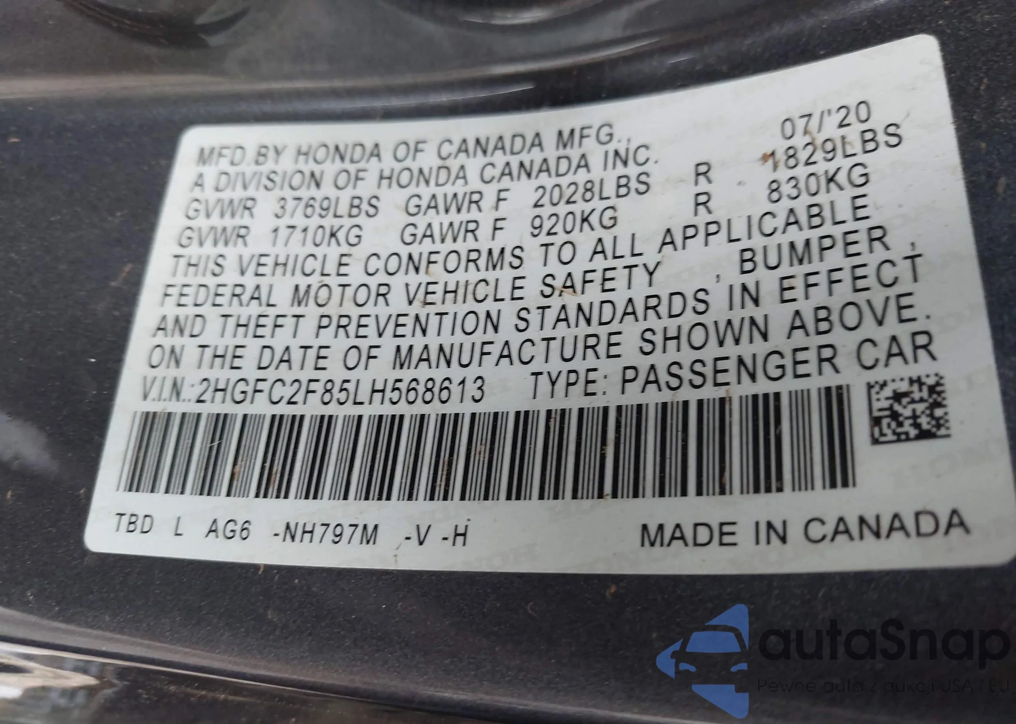 VIN: 2HGFC2F85LH568613