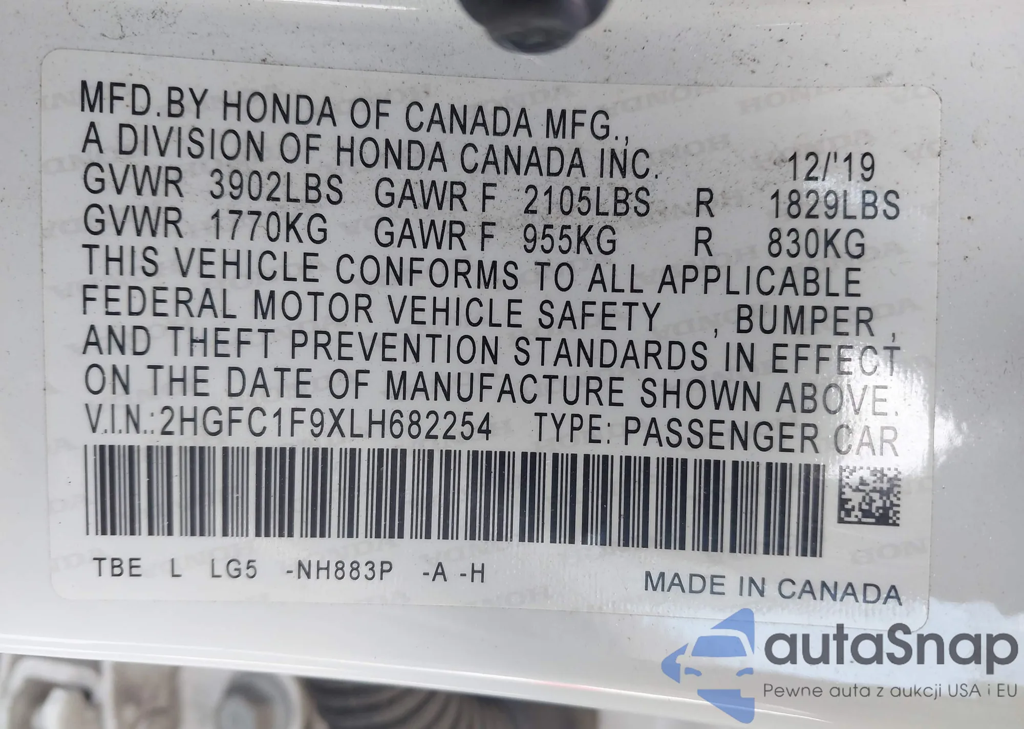 VIN: 2HGFC1F9XLH682254