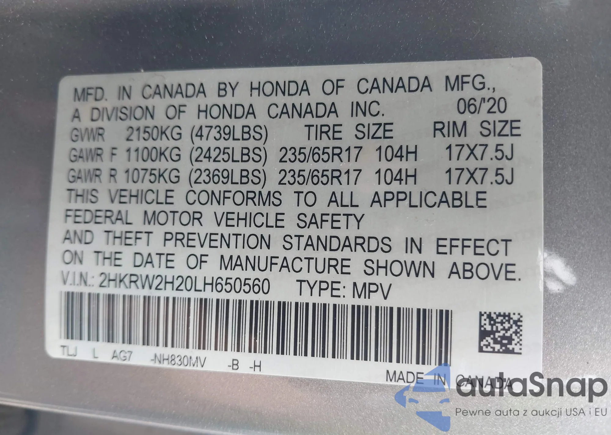 VIN: 2HKRW2H20LH650560