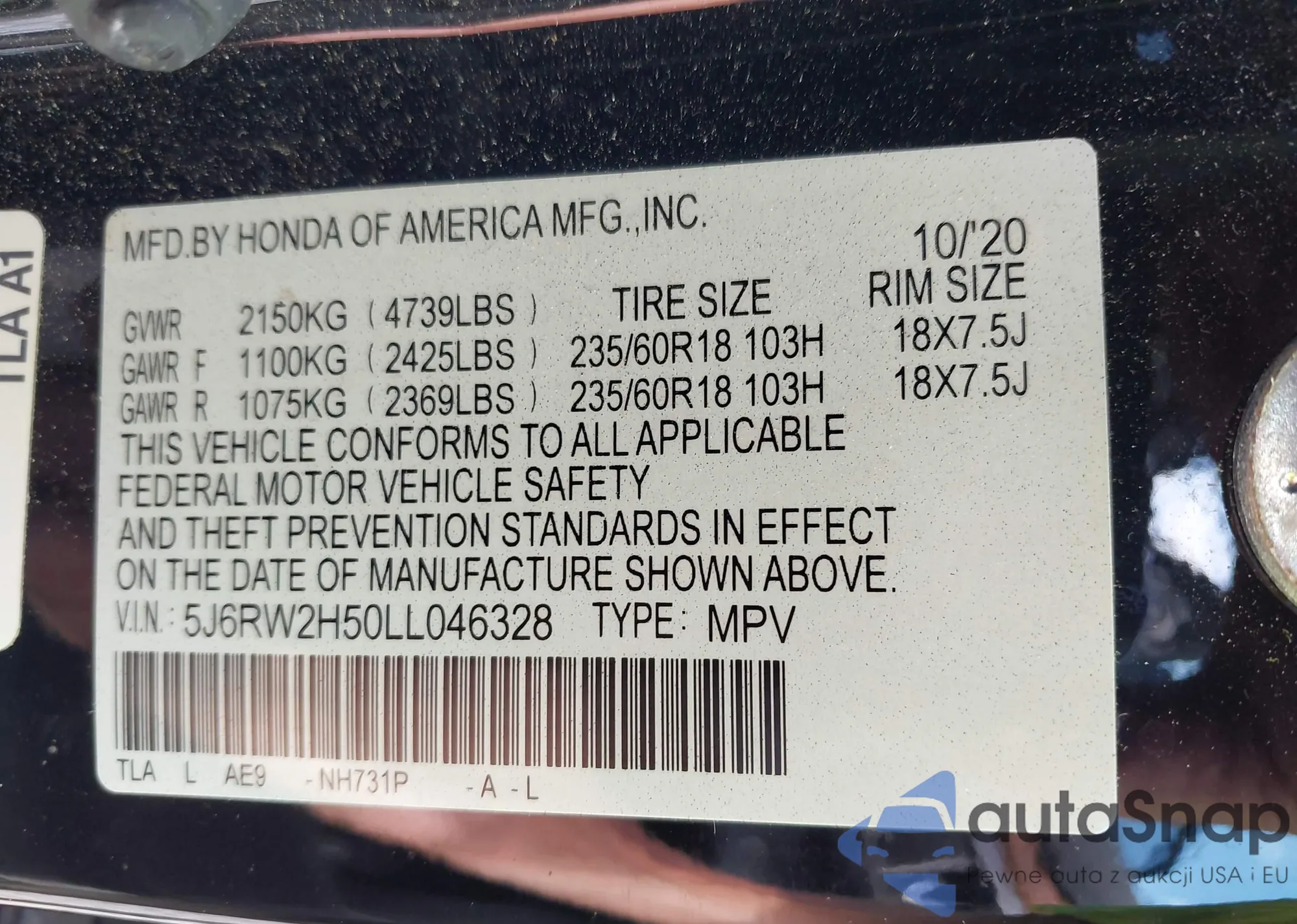VIN: 5J6RW2H50LL046328