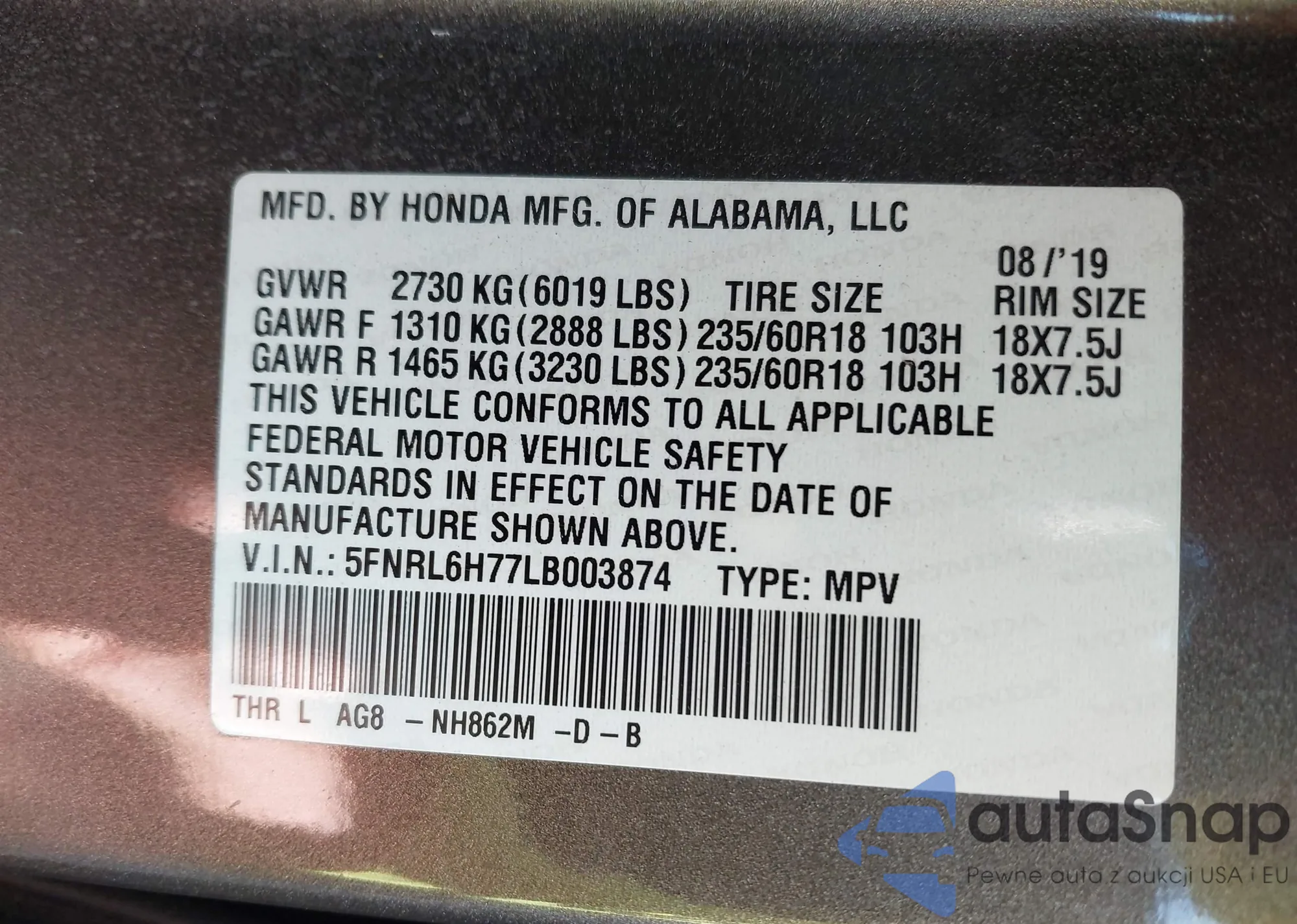 VIN: 5FNRL6H77LB003874