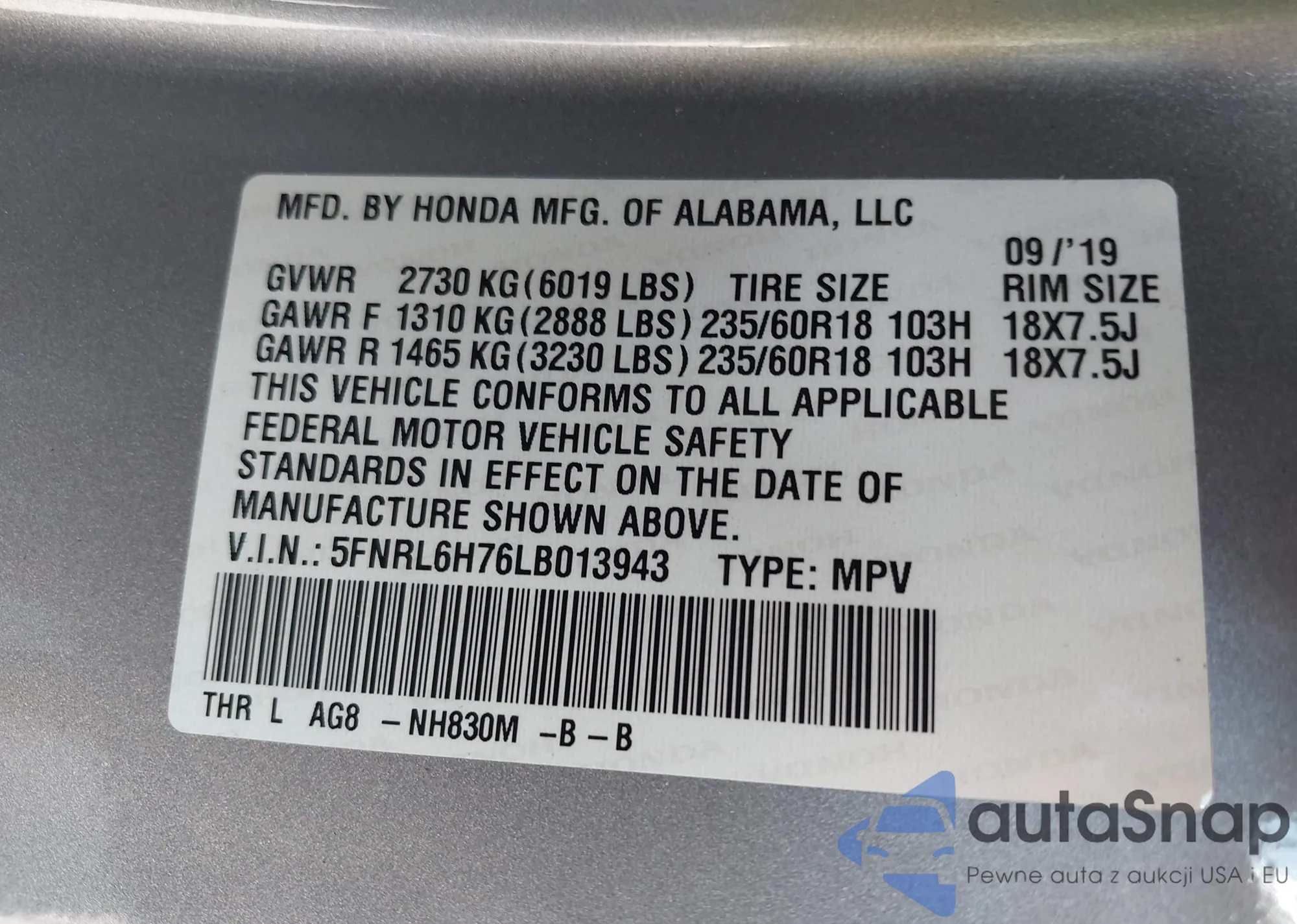 • VIN: 5FNRL6H76LB013943