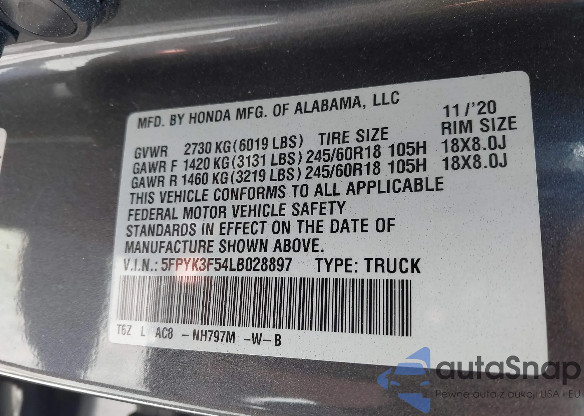 • VIN: 5FPYK3F54LB028897