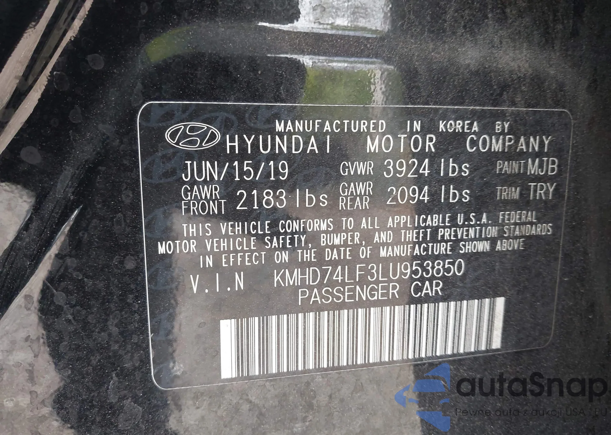 The car Hyundai Elantra 2020 (VIN KMHD74LF3LU953850) has documents that prevent registration. Export and registration may be difficult. Contact AutaSnap experts to find alternatives.