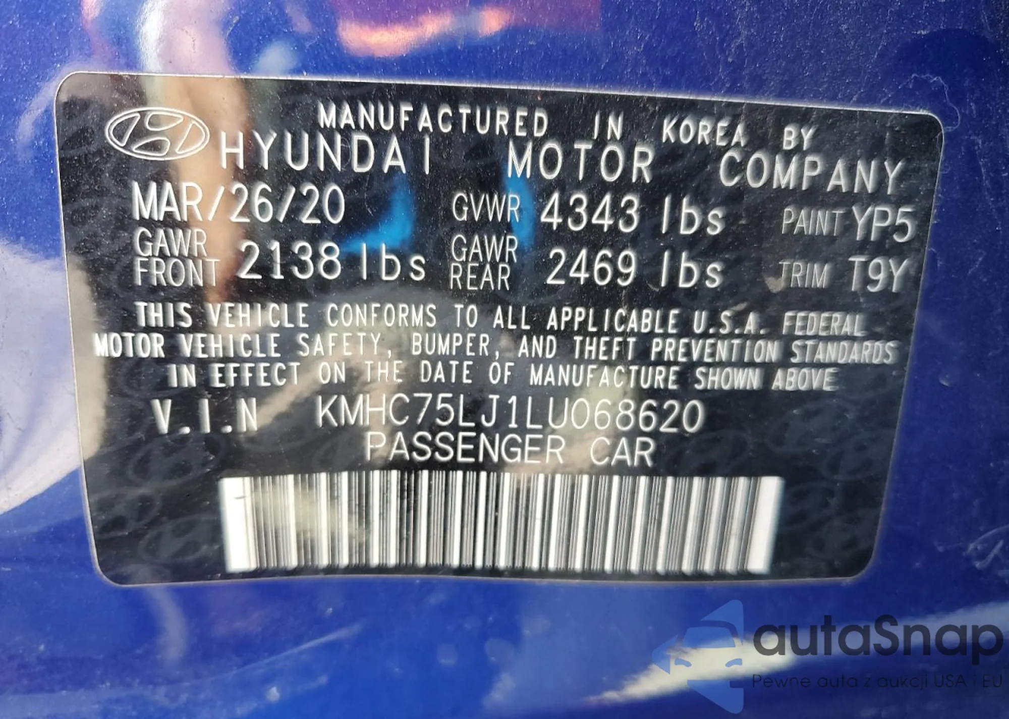 The car Hyundai IONIQ 2020 (VIN KMHC75LJ1LU068620) is sold by an unverified seller. We recommend checking the Carfax report and confirming registration possibilities before purchase.