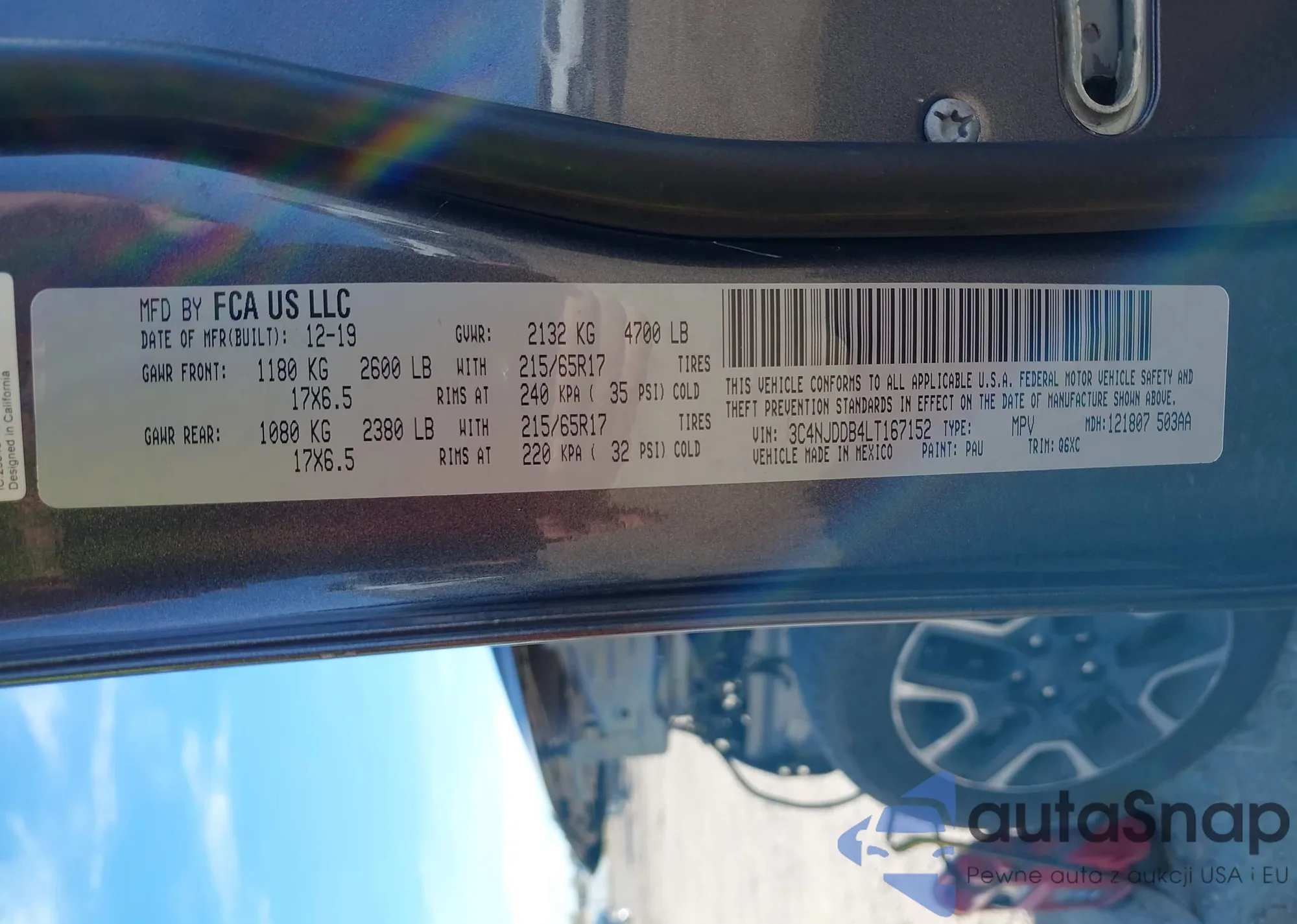 The car Jeep Compass 2020 (VIN 3C4NJDDB4LT167152) has not been auctioned before. The documents are clean, and the mileage matches or is below the market average. Sold by an insurance company – we recommend purchase. Delivery to the port will take approx. 6–8 weeks.