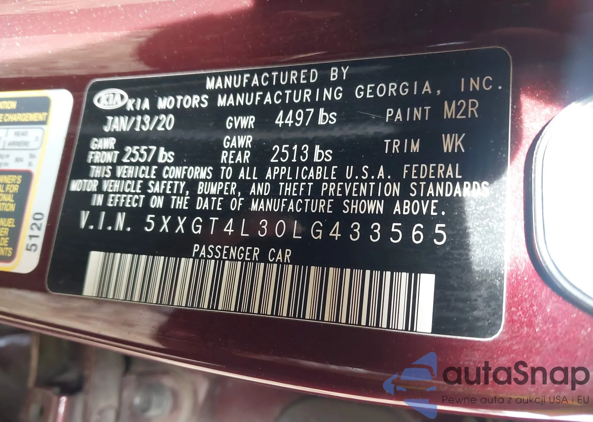 The car Kia Optima 2020 (VIN 5XXGT4L30LG433565) has not been auctioned before. The documents are clean, and the mileage matches or is below the market average. Sold by an insurance company – we recommend purchase. Delivery to the port will take approx. 6–8 weeks.