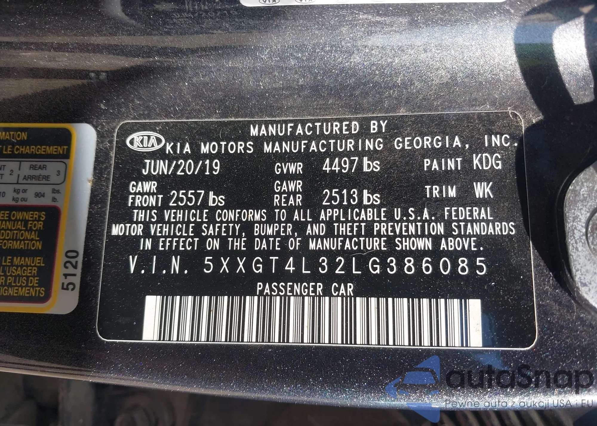 The car Kia Optima 2020 (VIN 5XXGT4L32LG386085) has documents that prevent registration. Export and registration may be difficult. Contact AutaSnap experts to find alternatives.