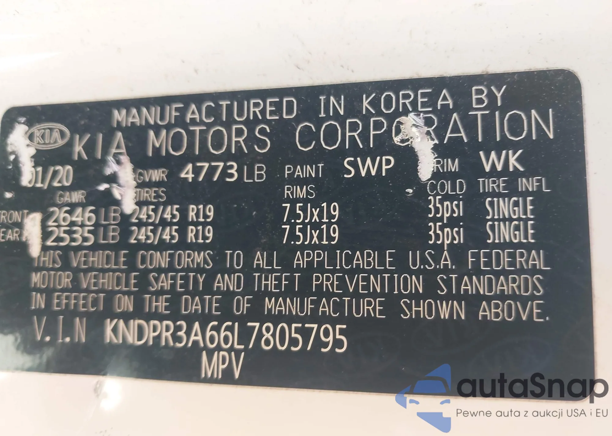 The car Kia Sportage 2020 (VIN KNDPR3A66L7805795) has not been auctioned before. The documents are clean, and the mileage matches or is below the market average. Sold by an insurance company – we recommend purchase. Delivery to the port will take approx. 6–8 weeks.