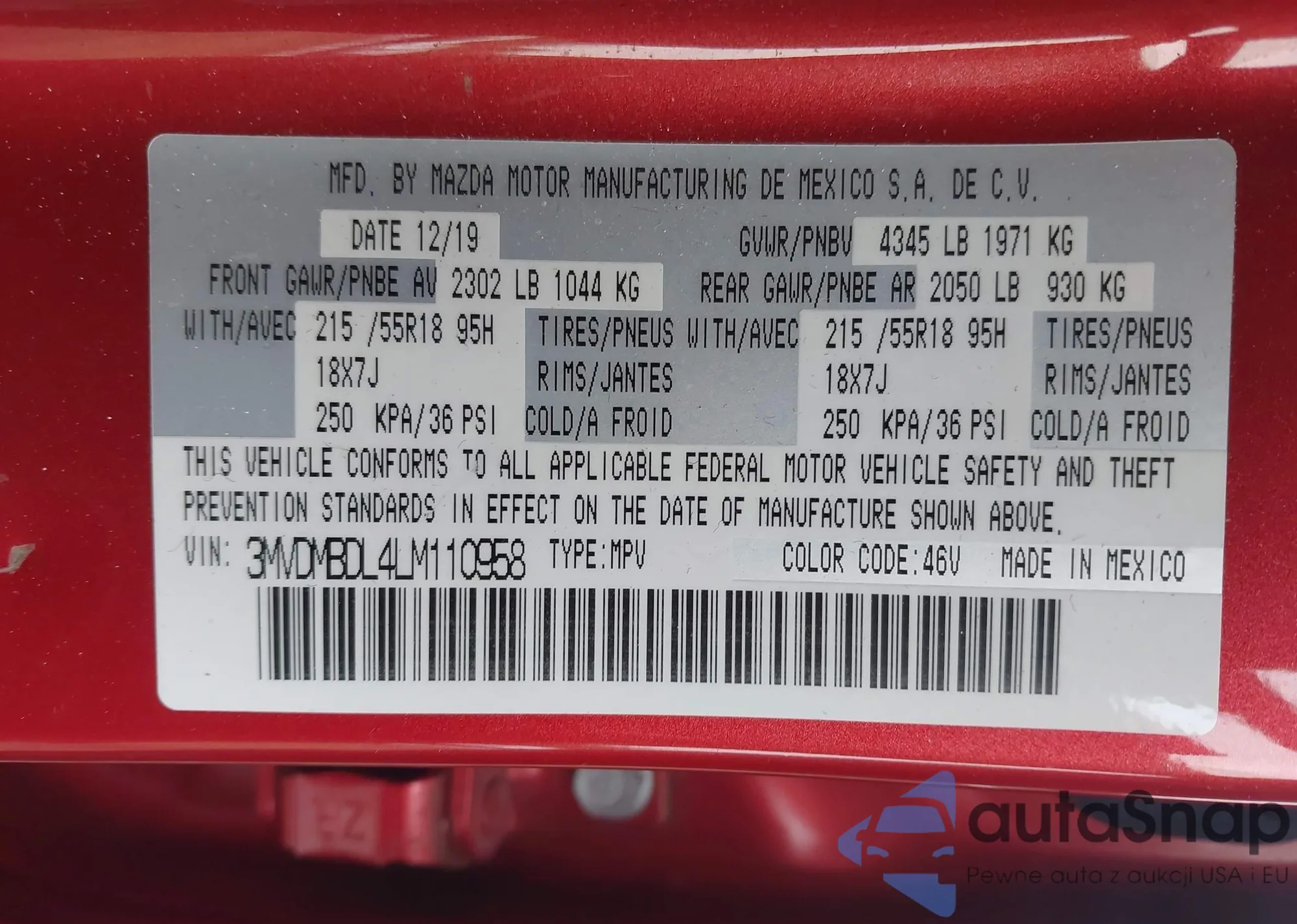 The car Mazda CX-30 2020 (VIN 3MVDMBDL4LM110958) has not been auctioned before. The documents are clean, and the mileage matches or is below the market average. Sold by an insurance company – we recommend purchase. Delivery to the port will take approx. 6–8 weeks.
