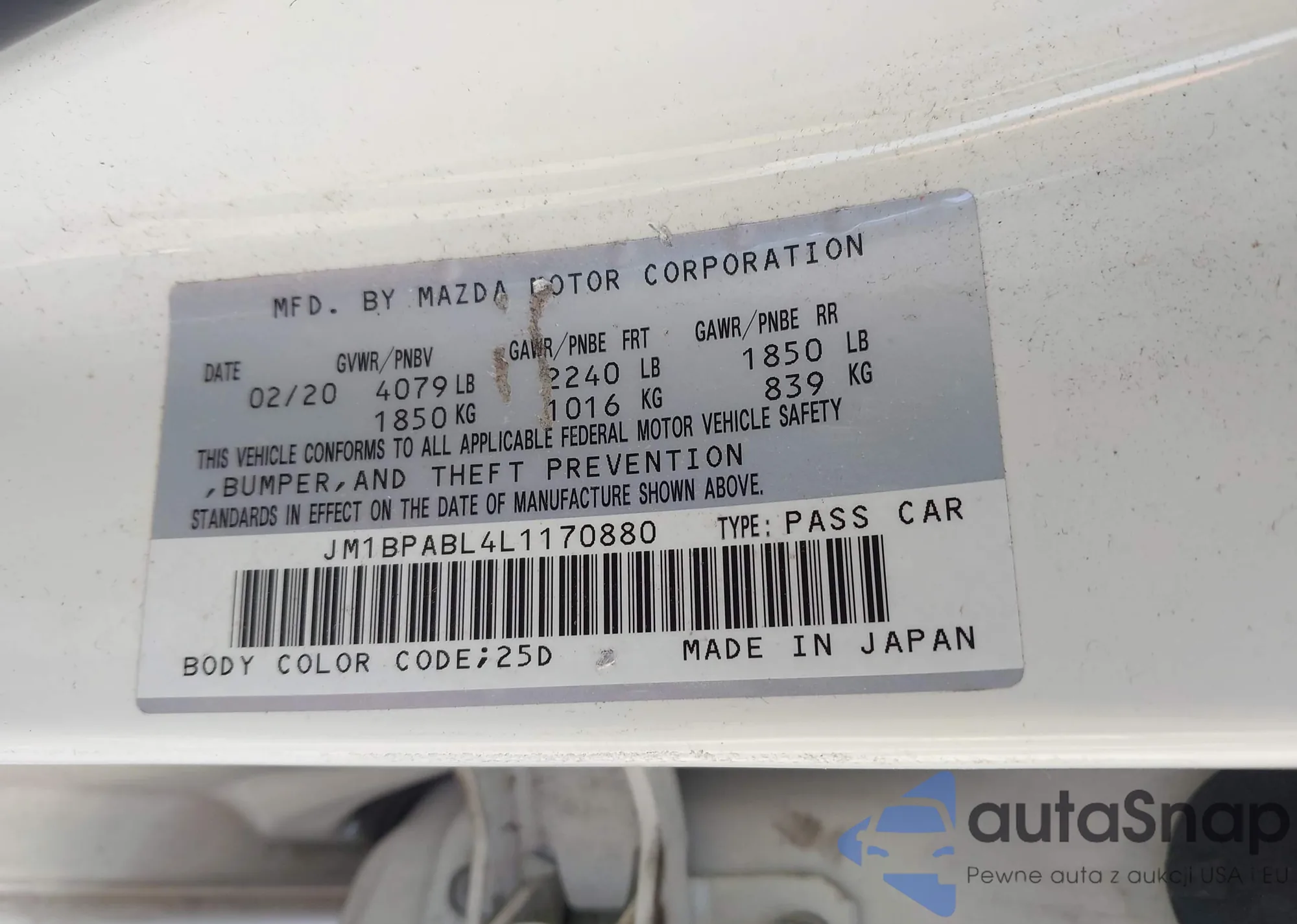 The car Mazda 3 2020 (VIN JM1BPABL4L1170880) has documents that prevent registration. Export and registration may be difficult. Contact AutaSnap experts to find alternatives.
