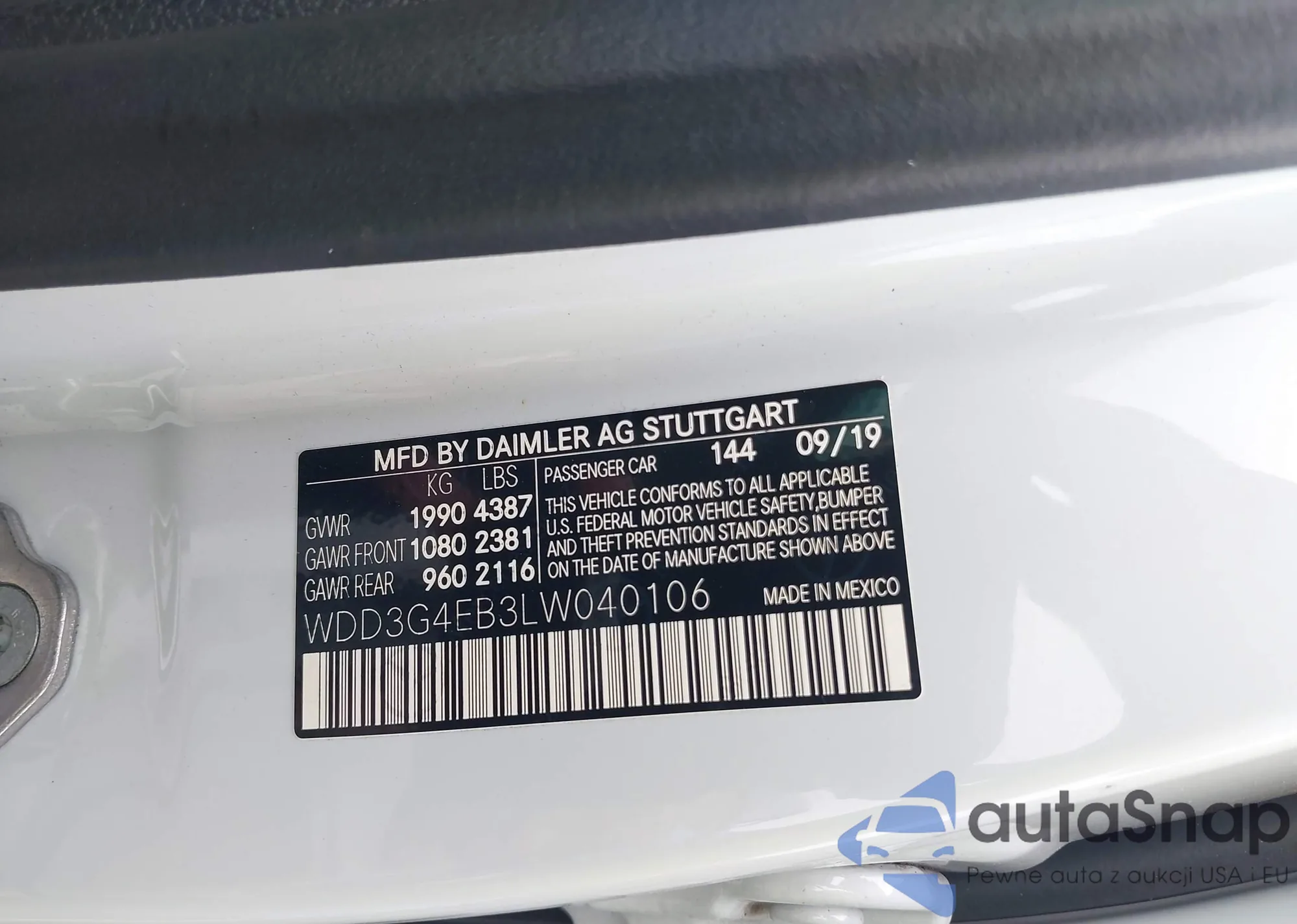The car Mercedes-Benz A-klasse 2020 (VIN WDD3G4EB3LW040106) has documents that prevent registration. Export and registration may be difficult. Contact AutaSnap experts to find alternatives.
