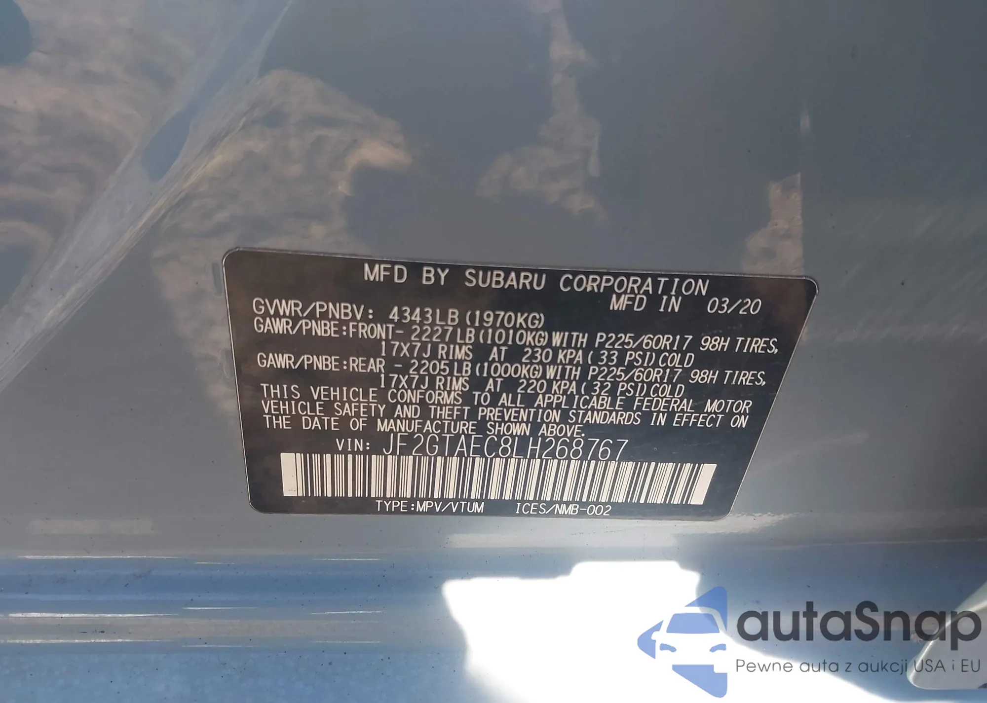 The car Subaru XV 2020 (VIN JF2GTAEC8LH268767) has not been auctioned before. The documents are clean, and the mileage matches or is below the market average. Sold by an insurance company – we recommend purchase. Delivery to the port will take approx. 6–8 weeks.