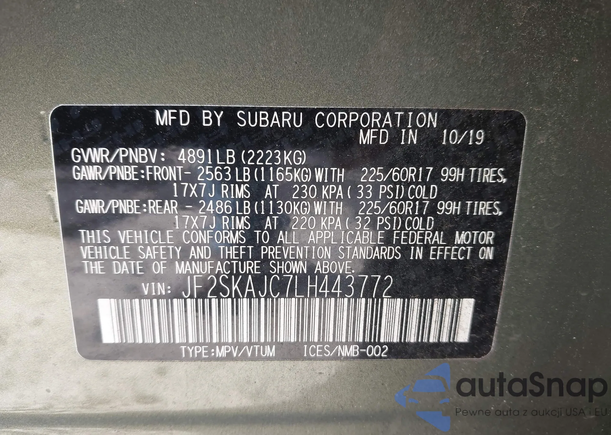 The car Subaru Forester 2020 (VIN JF2SKAJC7LH443772) has not been auctioned before. The documents are clean, and the mileage matches or is below the market average. Sold by an insurance company – we recommend purchase. Delivery to the port will take approx. 6–8 weeks.