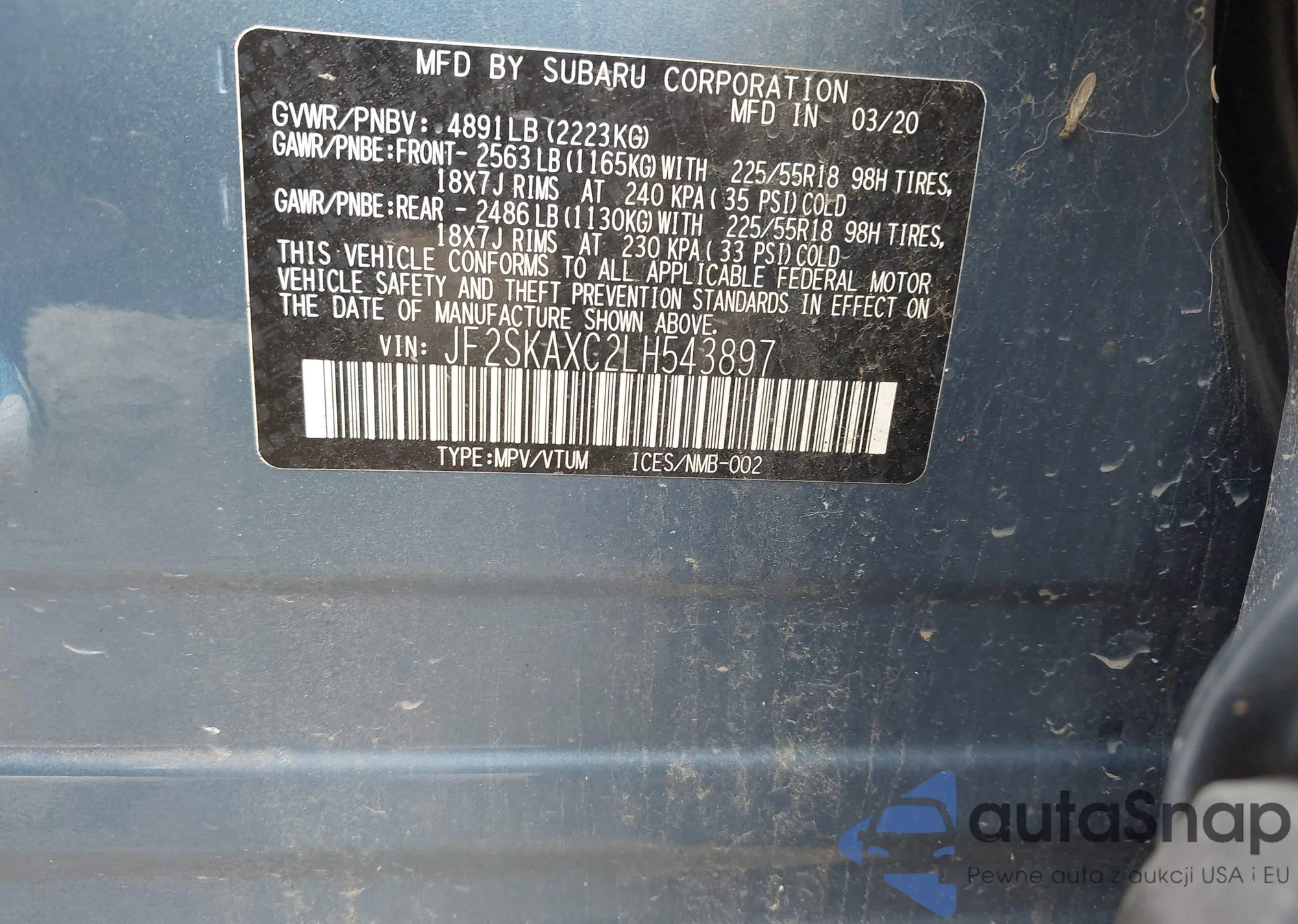 The car Subaru Forester 2020 (VIN JF2SKAXC2LH543897) has documents that prevent registration. Export and registration may be difficult. Contact AutaSnap experts to find alternatives.