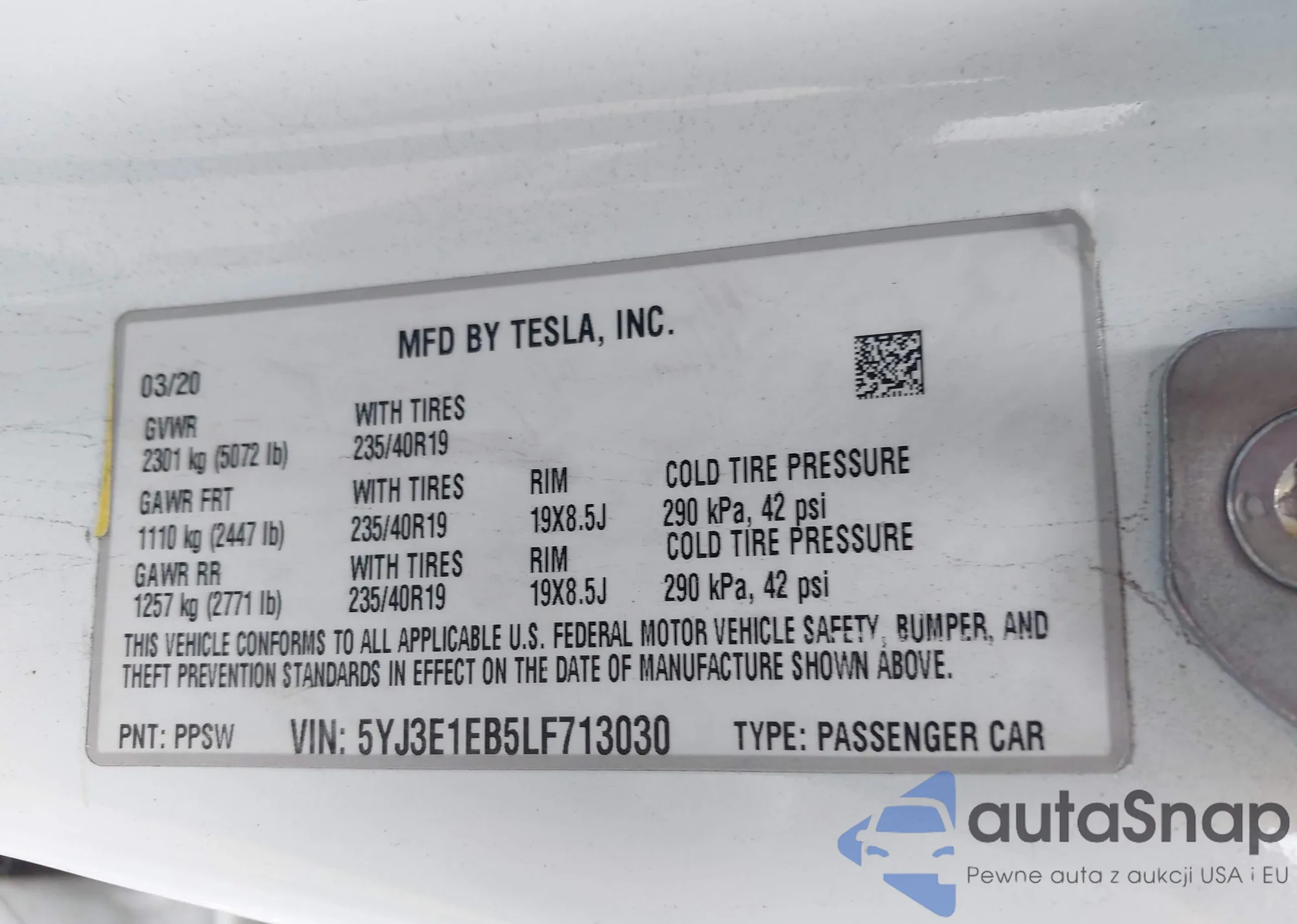 The car Tesla Model 3 2020 (VIN 5YJ3E1EB5LF713030) is sold by an unverified seller. We recommend checking the Carfax report and confirming registration possibilities before purchase.