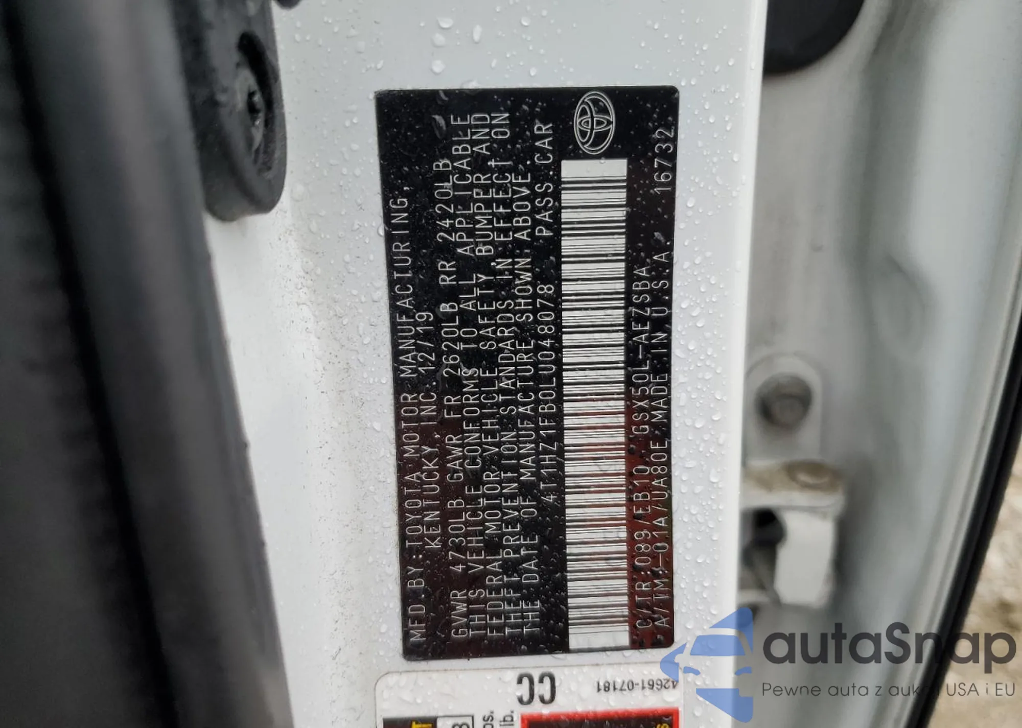The car Toyota Avalon 2020 (VIN 4T1HZ1FB0LU048078) has not been auctioned before. The documents are clean, and the mileage matches or is below the market average. Sold by an insurance company – we recommend purchase. Delivery to the port will take approx. 6–8 weeks.