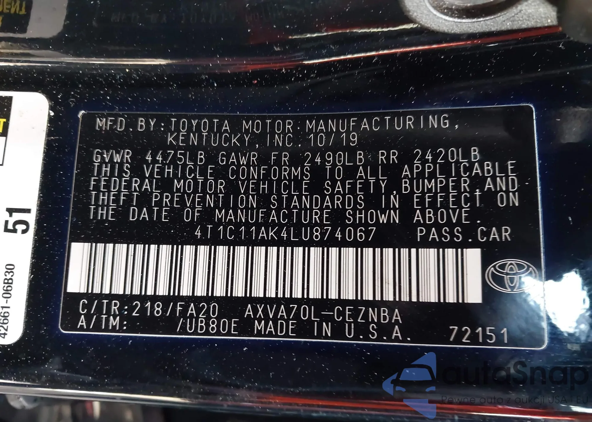 The car Toyota Camry 2020 (VIN 4T1C11AK4LU874067) has not been auctioned before. The documents are clean, and the mileage matches or is below the market average. Sold by an insurance company – we recommend purchase. Delivery to the port will take approx. 6–8 weeks.