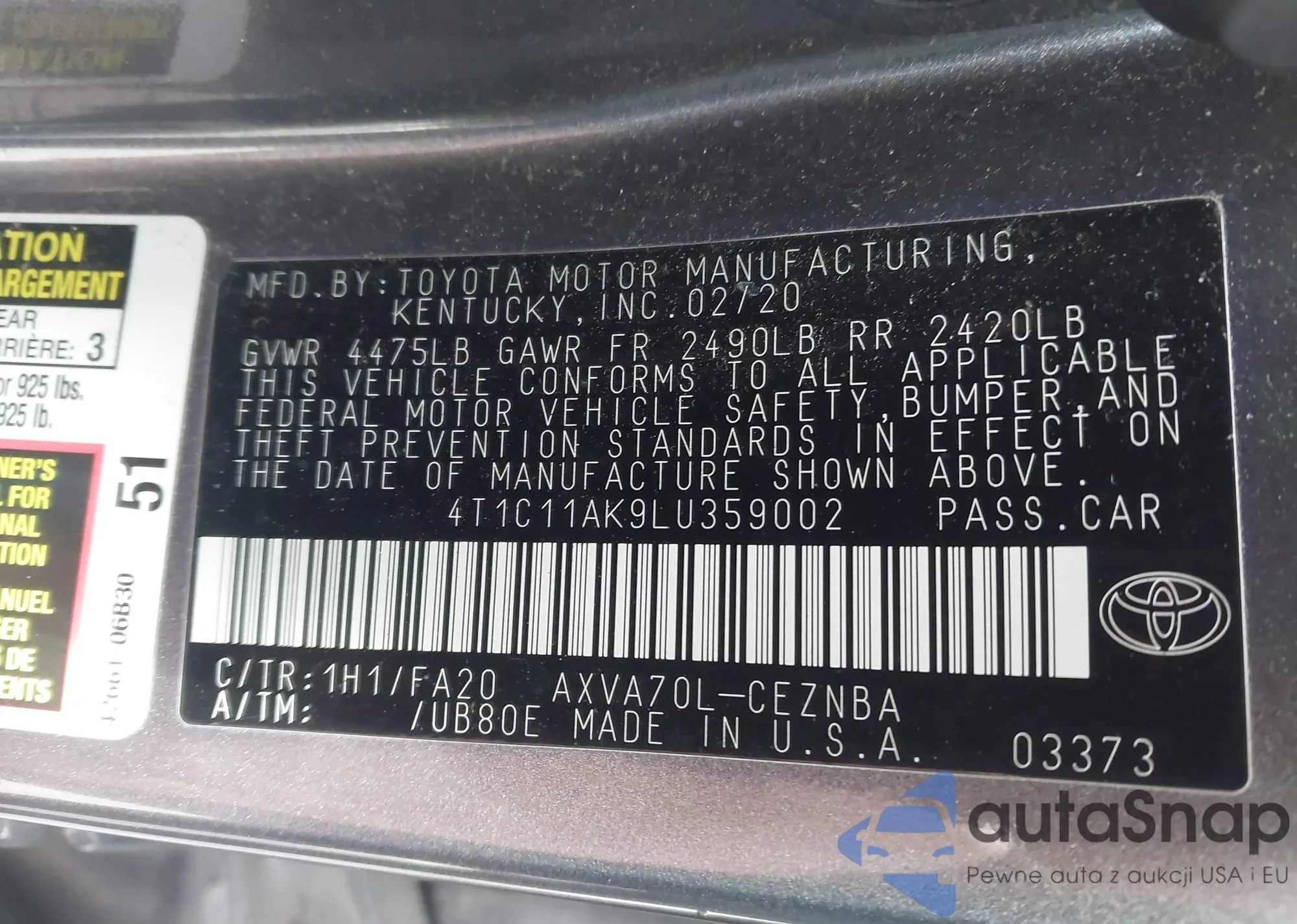 VIN: 4T1C11AK9LU359002