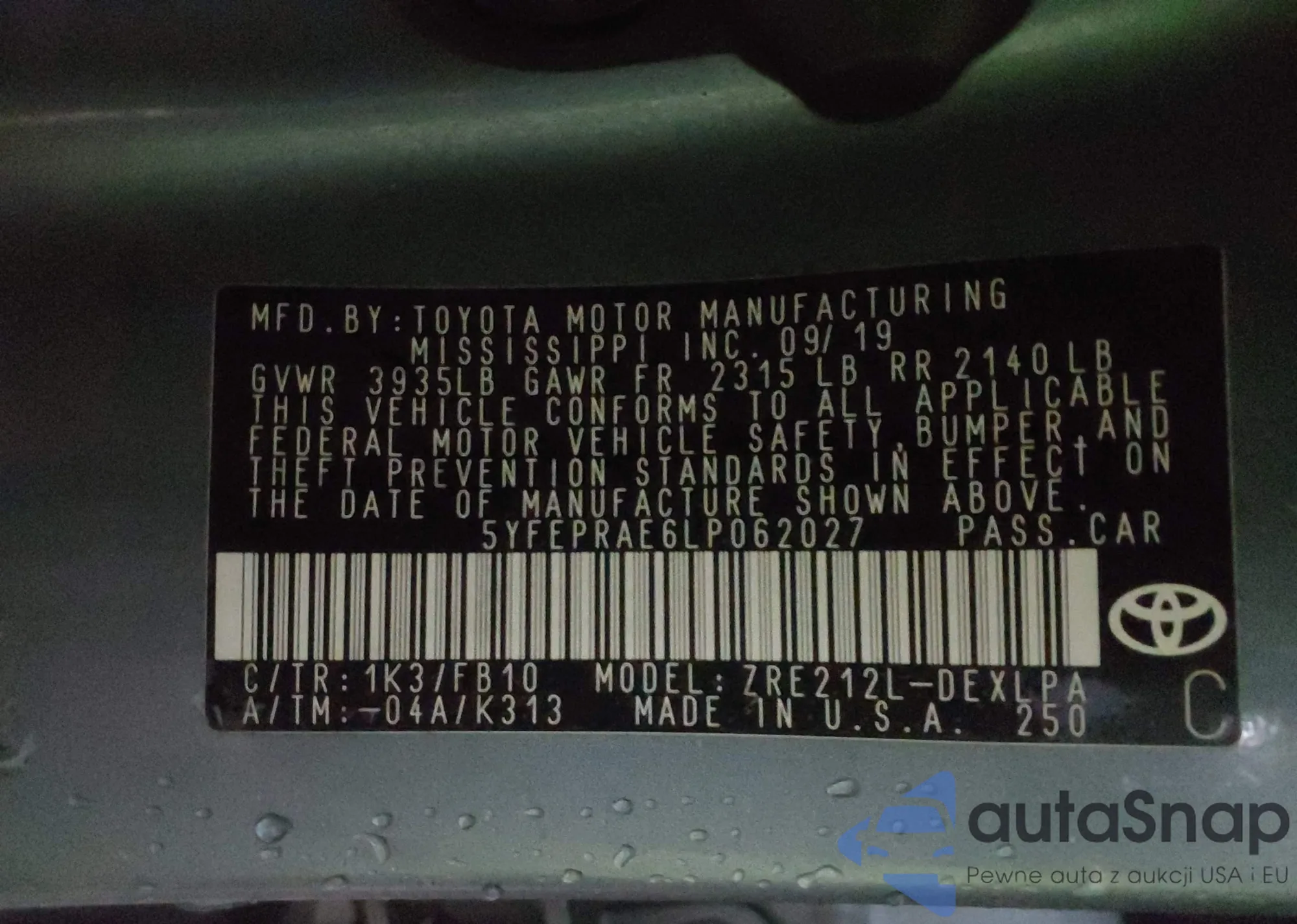 VIN: 5YFEPRAE6LP062027