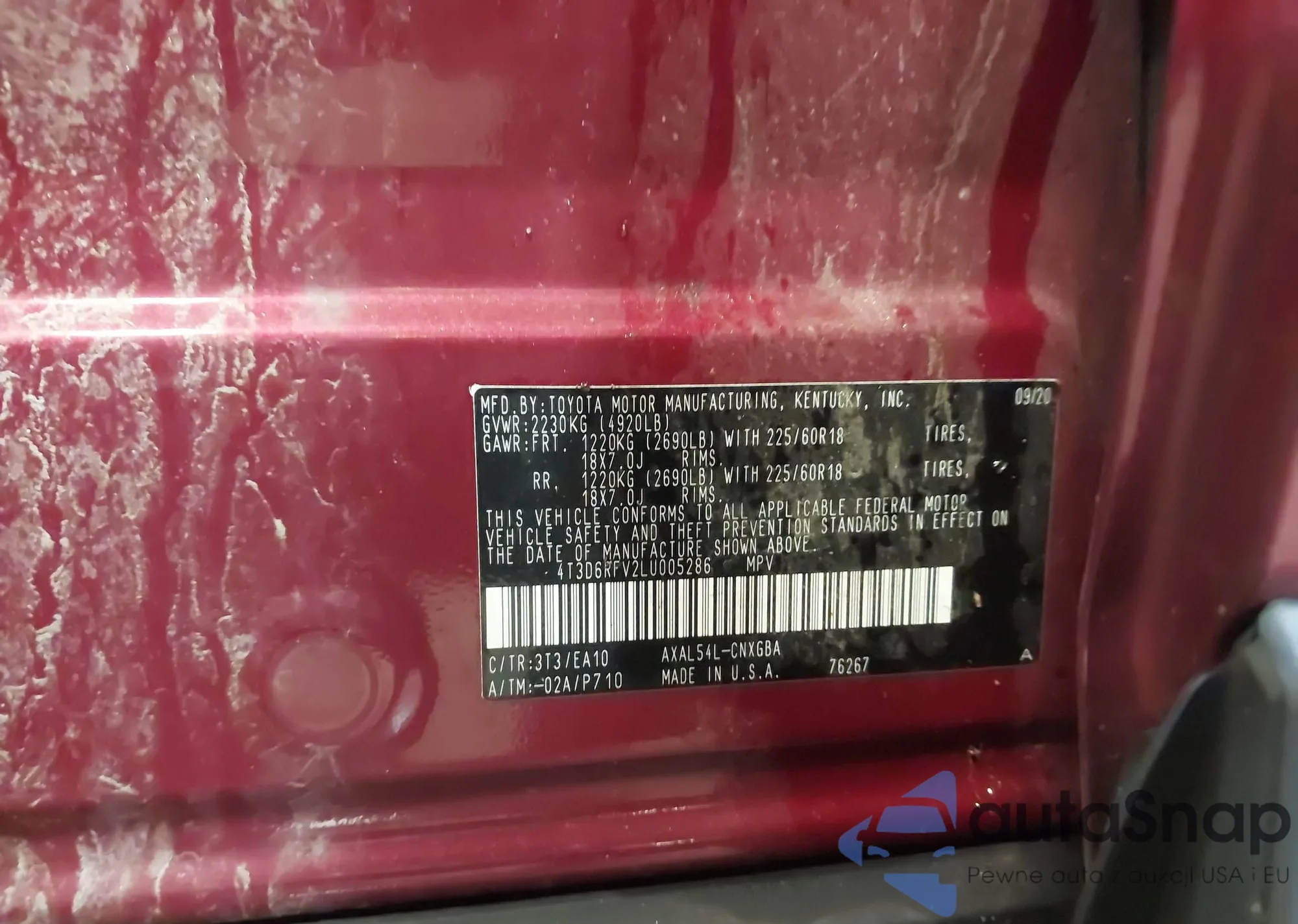 VIN: 4T3D6RFV2LU005286