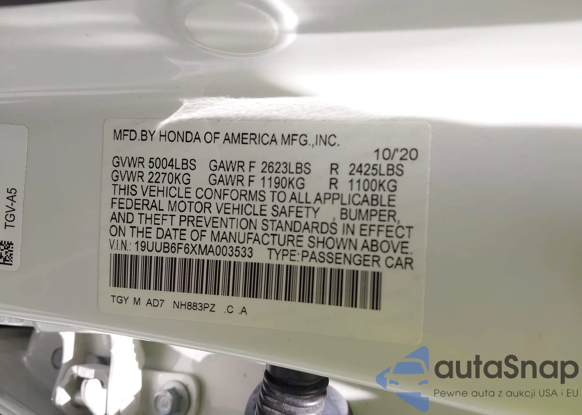 • VIN: 19UUB6F6XMA003533