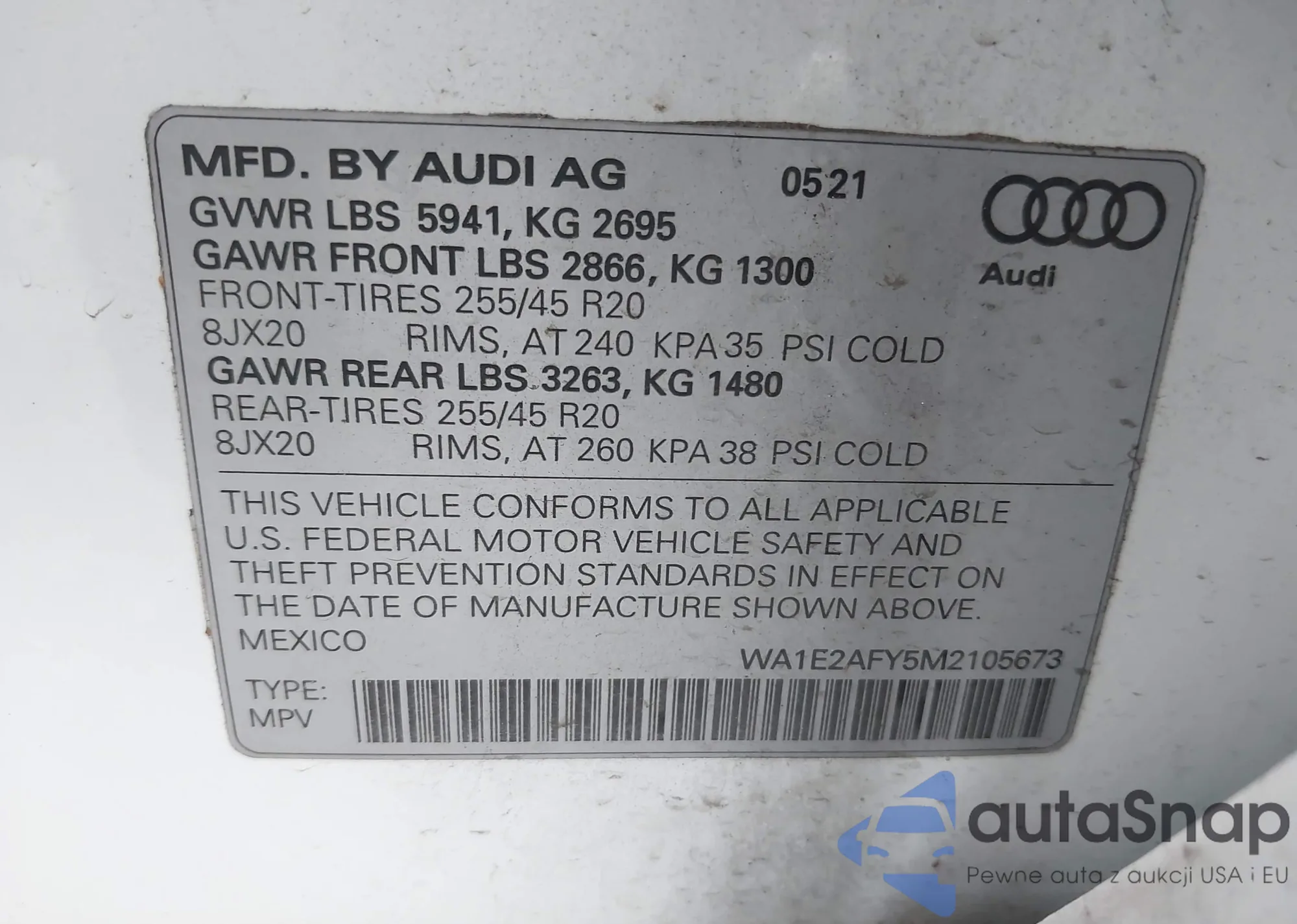 The car Audi Q5 2021 (VIN WA1E2AFY5M2105673) has documents that prevent registration. Export and registration may be difficult. Contact AutaSnap experts to find alternatives.