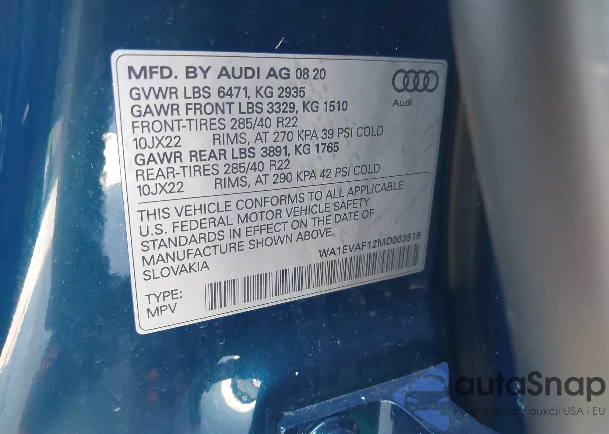 The car Audi Q8 2021 (VIN WA1EVAF12MD003519) has documents that prevent registration. Export and registration may be difficult. Contact AutaSnap experts to find alternatives.
