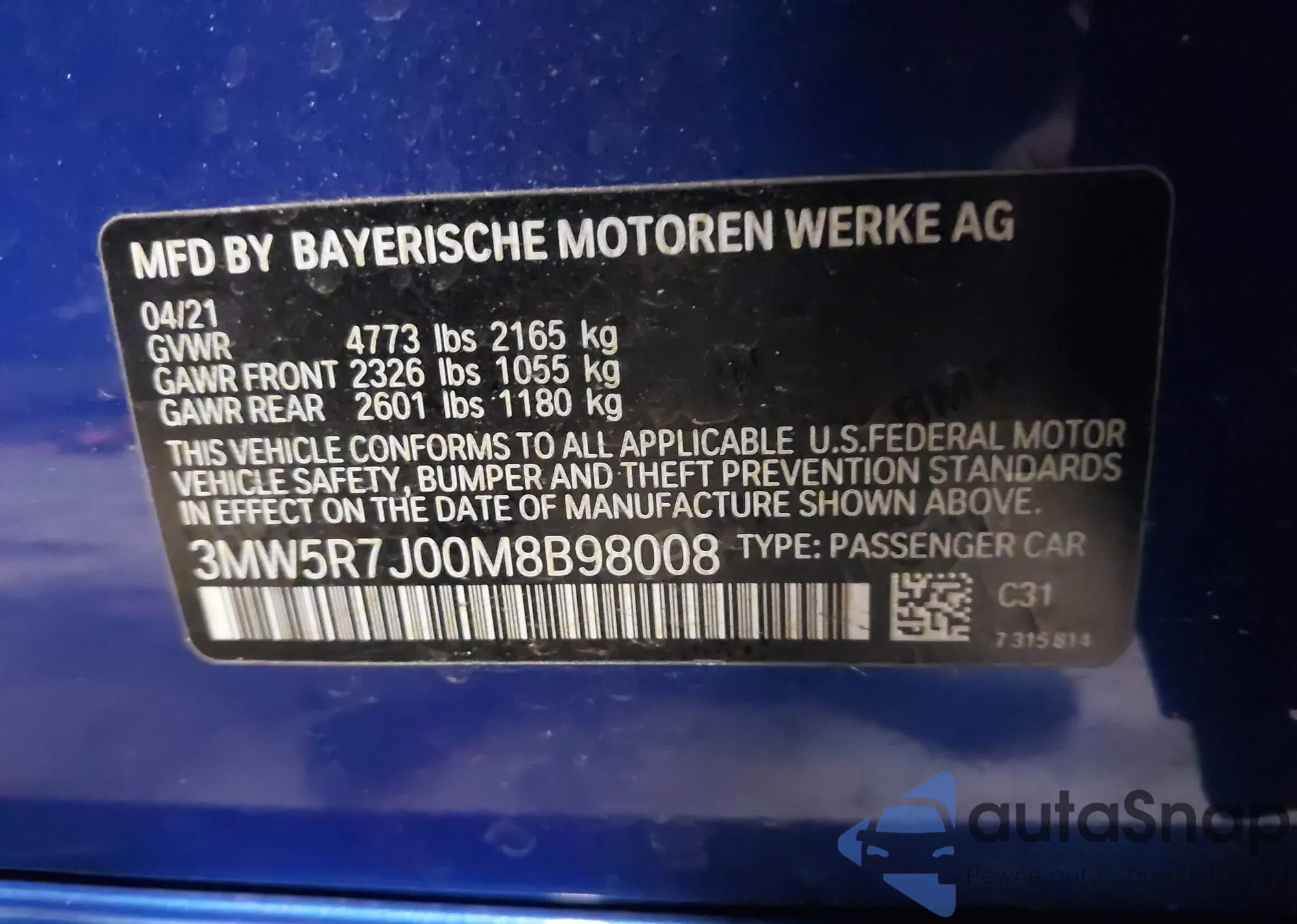 The car BMW 3er 2021 (VIN 3MW5R7J00M8B98008) has not been auctioned before. The documents are clean, and the mileage matches or is below the market average. Sold by an insurance company – we recommend purchase. Delivery to the port will take approx. 6–8 weeks.