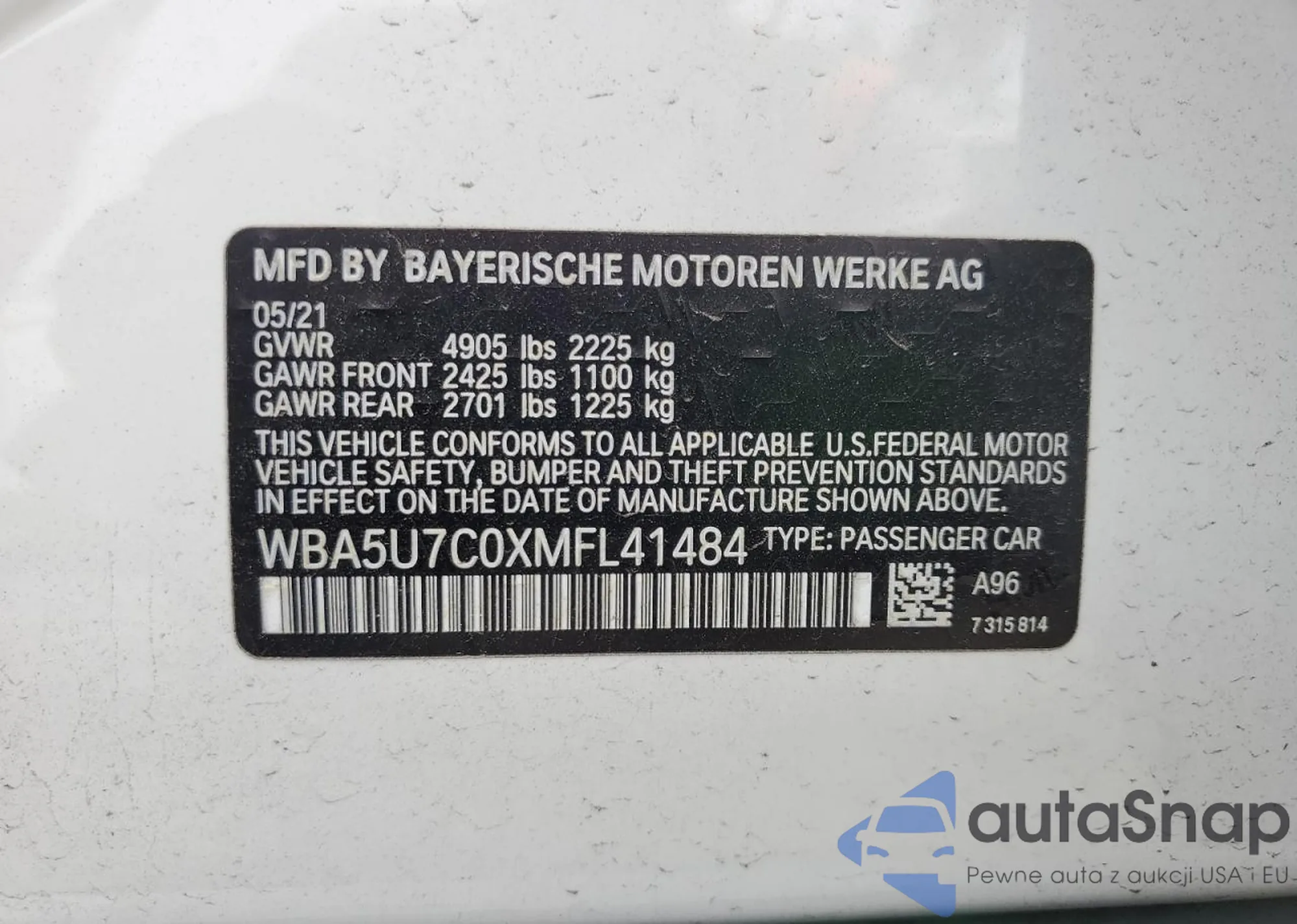 The car BMW M3 2021 (VIN WBA5U7C0XMFL41484) has documents that prevent registration. Export and registration may be difficult. Contact AutaSnap experts to find alternatives.