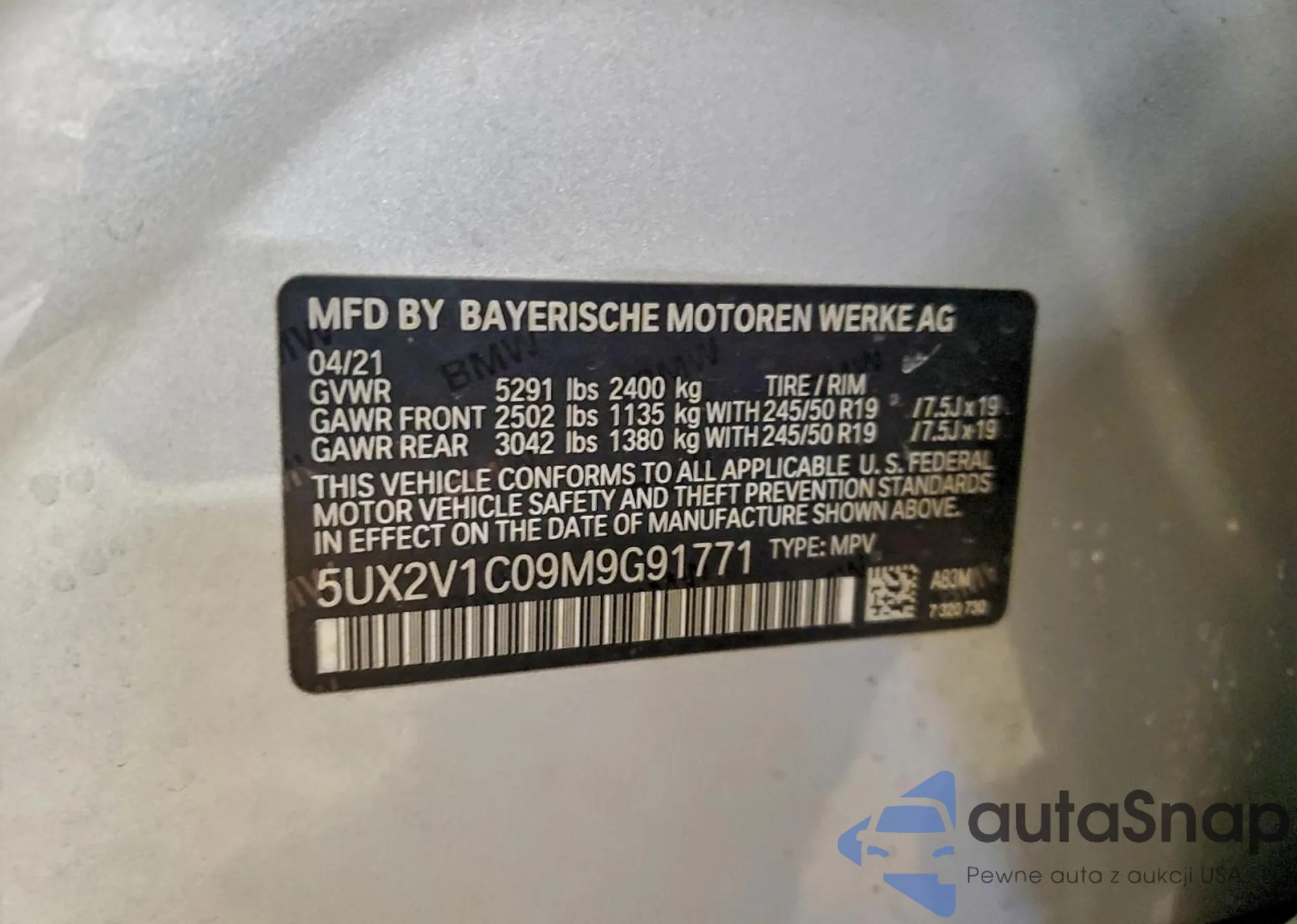 The car BMW X4 2021 (VIN 5UX2V1C09M9G91771) has not been auctioned before. The documents are clean, and the mileage matches or is below the market average. Sold by an insurance company – we recommend purchase. Delivery to the port will take approx. 6–8 weeks.