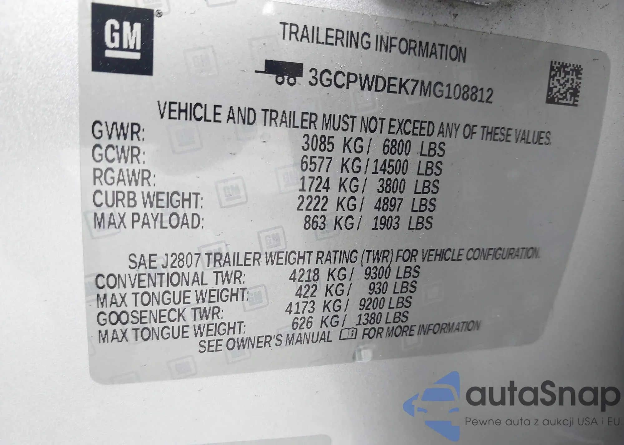 • VIN: 3GCPWDEK7MG108812