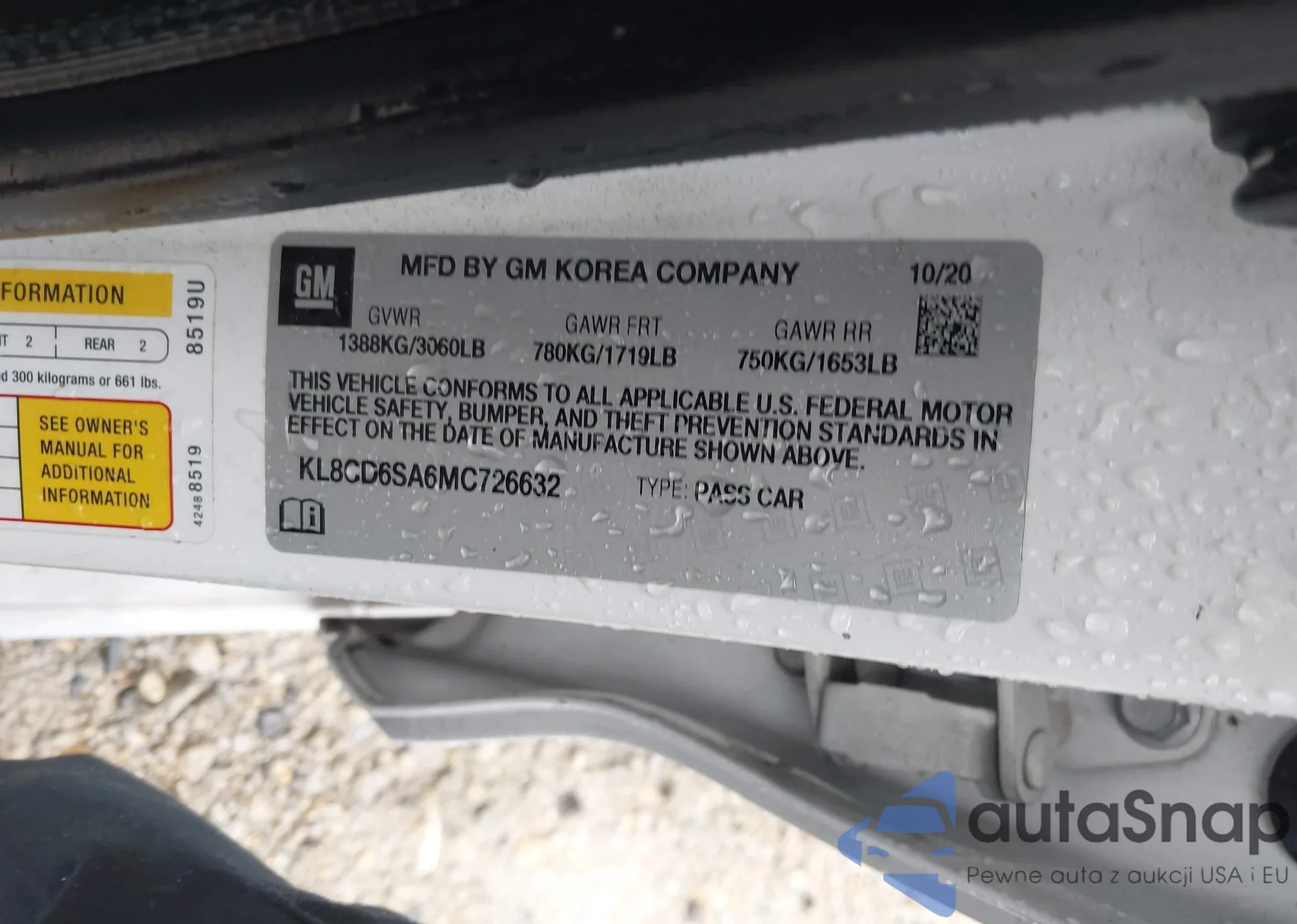 The car Chevrolet Spark 2021 (VIN KL8CD6SA6MC726632) has not been auctioned before. The documents are clean, and the mileage matches or is below the market average. Sold by an insurance company – we recommend purchase. Delivery to the port will take approx. 6–8 weeks.