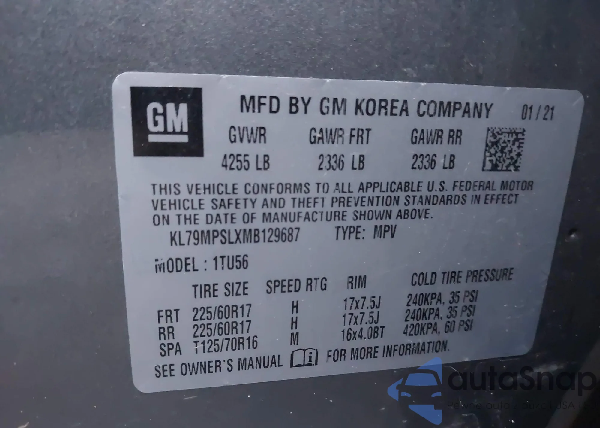 VIN: KL79MPSLXMB129687