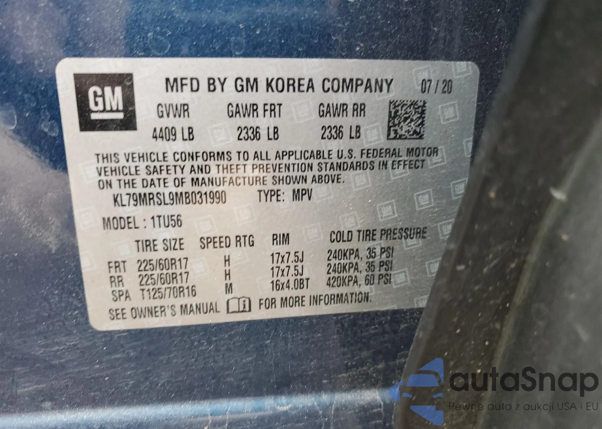 The car Chevrolet TrailBlazer 2021 (VIN KL79MRSL9MB031990) has not been auctioned before. The documents are clean, and the mileage matches or is below the market average. Sold by an insurance company – we recommend purchase. Delivery to the port will take approx. 6–8 weeks.