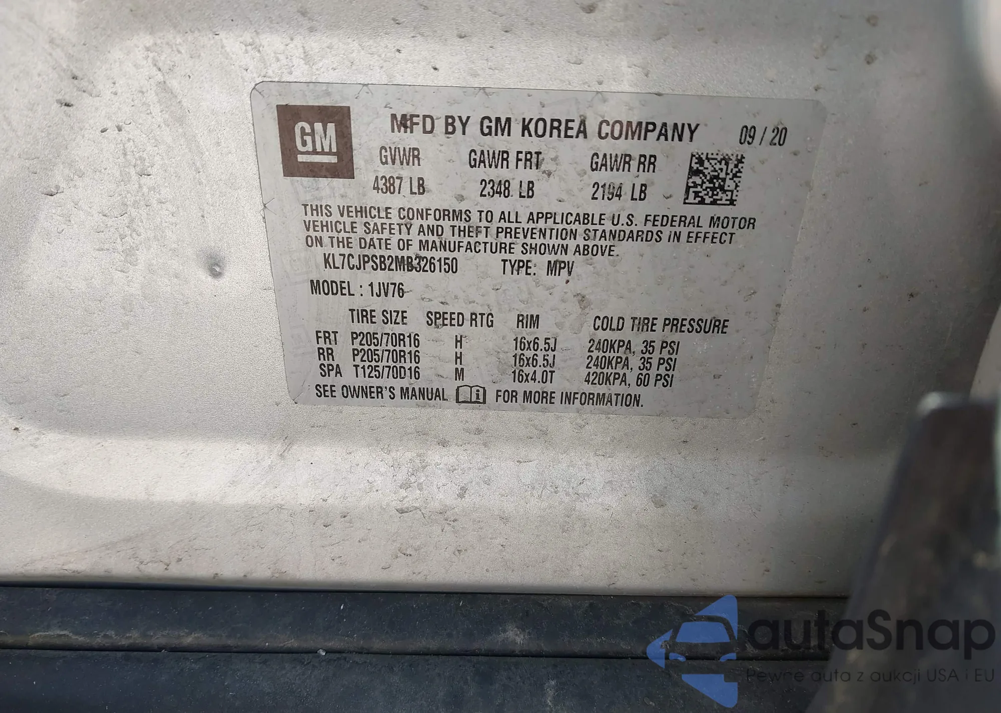 The car Chevrolet Trax 2021 (VIN KL7CJPSB2MB326150) has not been auctioned before. The documents are clean, and the mileage matches or is below the market average. Sold by an insurance company – we recommend purchase. Delivery to the port will take approx. 6–8 weeks.